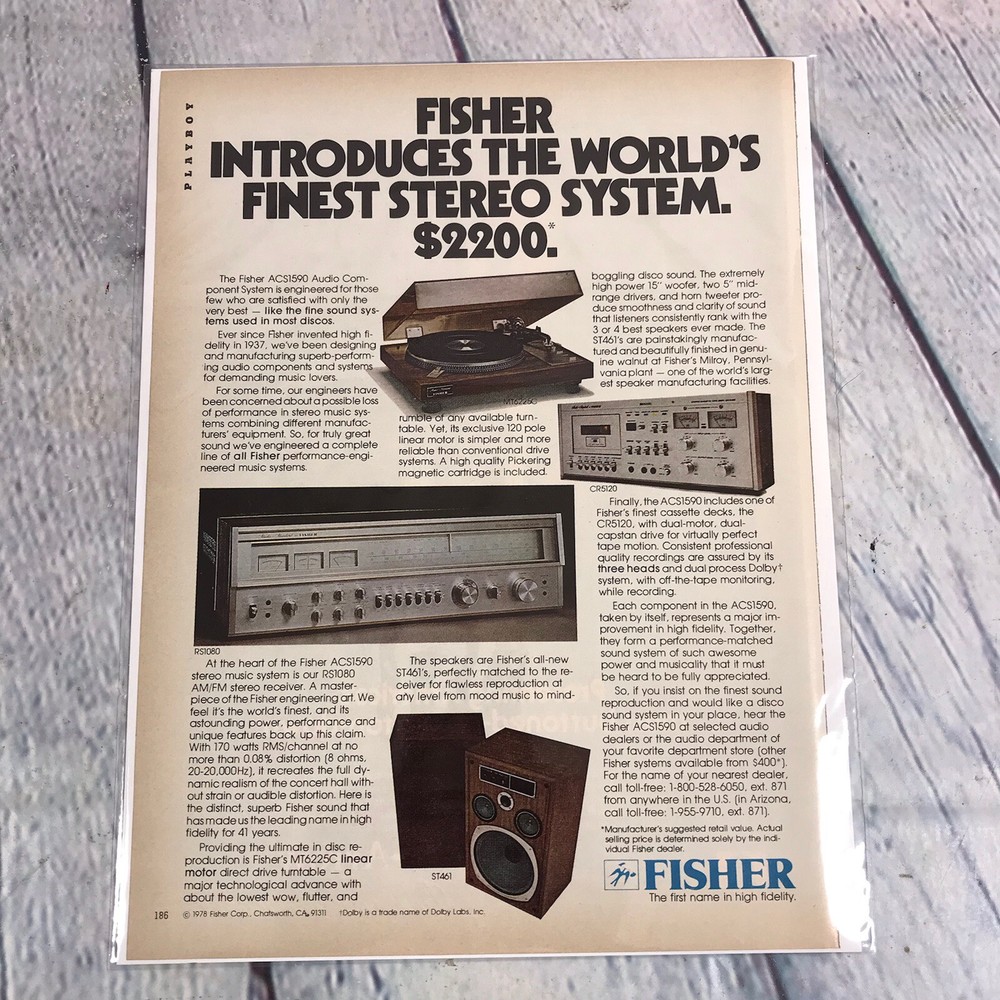 1978 Fisher Stereo System Speakers Vintage Print Ad/Poster Promo Art Magazine Page / Advertisement Paper Ephemera These are original print ads removed from printed publications....we remove each one by hand. Ads are bagged and boarded. Cardboard is 11" x 8.5".....this will give you an idea of the ad size. We ship between cardboard box sleeves for protection. We offer combined shipping.....we charge $4.95 for the first ad and a $1.00 for each additional with a cap of $8.95 shipping cost. Example: 3 ads=$6.95 5 ads=$8.95 20 ads= $8.95 Add all your items to the cart and purchase together to get combine shipping.