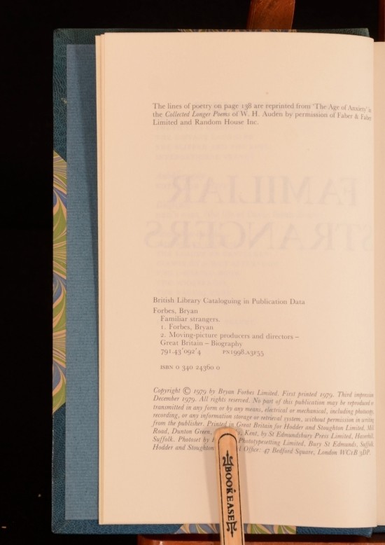 Click here to see our other books! Familiar Strangers Bryan Forbes 1979 Hodder and Stoughton : London 8.5" by 5" 371pp SUMMARY A beautifully bound first edition of this novel by Bryan Forbes. Fine Binding Overall Condition: Fine This book weighs 1 KG when packed UK Postage: £ 3.99 US Postage: £ 22.99 EU Postage : £ 16.99 European Postage: £ 17.99 Asia Postage: £ 22.99 Worldwide Postage: £ 28.99 DESCRIPTION First edition, third impression. Bryan Forbes was an English film director, screenwriter, actor and novelist. Best known as the director of The Stepford Wives, he also wrote a selection of novels of which this is his fourth. CONDITION Beautifully rebound in a blue half crushed morocco binding with green and blue patterned boards. Externally, in lovely condition. Bookplate of Burnell to front pastedown. Internally, firmly bound. Pages bright and clean. Overall Condition: Fine GLOSSARY OF TERMS Overall Condition (Dustwrapper condition rating is shown after that for the book itself, where a dustwrapper is present) Fine - Very well preserved copy showing very little wear Very Good Indeed - Only one or two minor faults, really a very attractive copy Very Good - Quite a wide term meaning no major faults but probably several smaller ones often expected given the age of the book, but still a respectable copy Good - Meaning not very good. Some more serious faults as will be described in the condition report under 'condition' Good Only - Meaning one or more faults that could really do with repair Fair - As with good only above but with other faults leaving a compromised copy even after repair Poor - Really bad and possibly seriously incomplete. We only sell books in this condition where their rarity or value makes them attractive none the less. Major defects will be described. GUARANTEE We offer a full money back guarantee on our descriptions. Please ask for details and conditions. We prefer PAYPAL. If you pay via PAYPAL we will post the item off the same or the next working day with the postage you have selected. Please note we cannot accept USD cheques