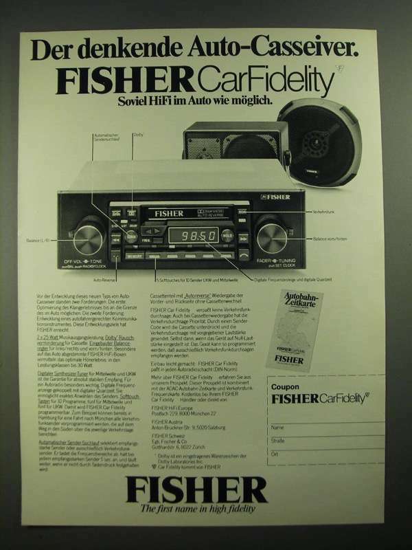 Item ID: EH0541 This listing is for a vintage paper advertisement. This is a 1979 ad for a Fisher Car Stereo in German! The size of the ad is approximately 8.5x11inches. The caption for this ad is 'Der denkende Auto-Casseiver. Fisher CarFideilty Soviel HiFi im Auto wie Moglich' The ad is in great condition. This vintage ad would look great framed and displayed! Add it to your collection today!
