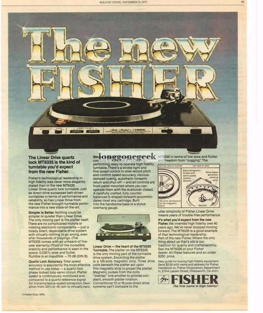 ADVERTISEMENT : 1979 Fisher MT6335 Turntable Stereo Hi-Fi Vtg Print Ad ThSIZE APPROXIMATELY: 12.5" x 10" CONDITION : Excellent...no tears, stains, creases Please note: This sale is for the vintage paper advertisement shown and not the item in the advertisement. It is not a copy, reprint or repro of any kind. Why not purchase one (or more) now! These old advertisements are ideal for: Collectors Historians Museums An intriguing gift Home and Business decor Don't just think of these as old pieces of paper. These are pieces of history. They show the changing fashions, architecture, furniture, design aesthetics and much more over the course of time. Many old ads have detailed info about the product they are advertising and can help with research. They also make a fine substitute for expensive artwork. Many old ads are very beautiful, or have bold graphics; many are drawn and signed by famous artists and illustrators. You could decorate your business, whole house or apartment, man or woman cave with vintage advertisements for the same price as one piece of fine art. Like this item? Why not purchase it now! About The Advertisements All advertisements are carefully removed from the source (magazines, newspapers, books, etc.) and are completely original. No copies, reprints or reproductions of any kind . Most vintage ads were printed on very thin paper and so some of the printing or advertisement from the reverse side may be visible. Ads are shipped flat and are packaged using archival acid-free backing boards and acid-free, clear plastic sleeves. Payment, Shipping and Returns I accept Paypal. Combined Shipping: I only charge shipping for one ad and/or print, no matter how many are purchased, if all items are paid for with a single payment. Items paid for separately will be shipped separately and do not qualify for discounts. If you are having trouble making a combined payment for all your items, please contact me BEFORE making your payment. I may be able to help out and save you some money. 30 day return policy for any reason Thanks for looking!