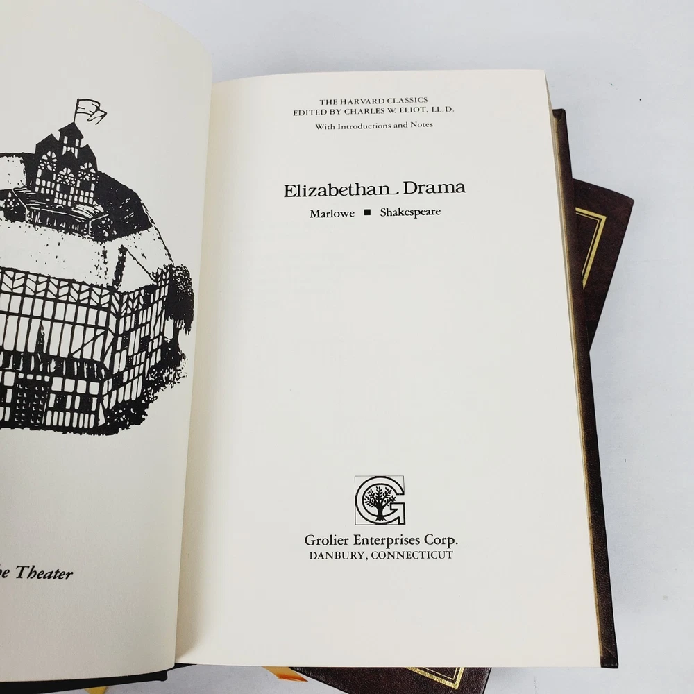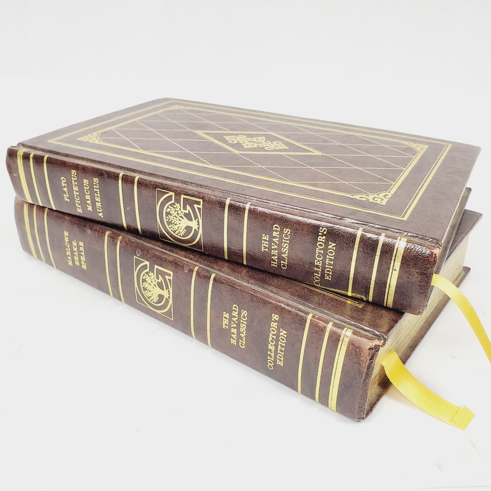 1980 Harvard Classics/Plato/Marcus Aurelius/Shakespeare/Leather Gilded Top Books. Good condition. Gilded page edges and cover designs. Some corner wear to covers. A few pages in the Plato book have faded yellow highlighting.