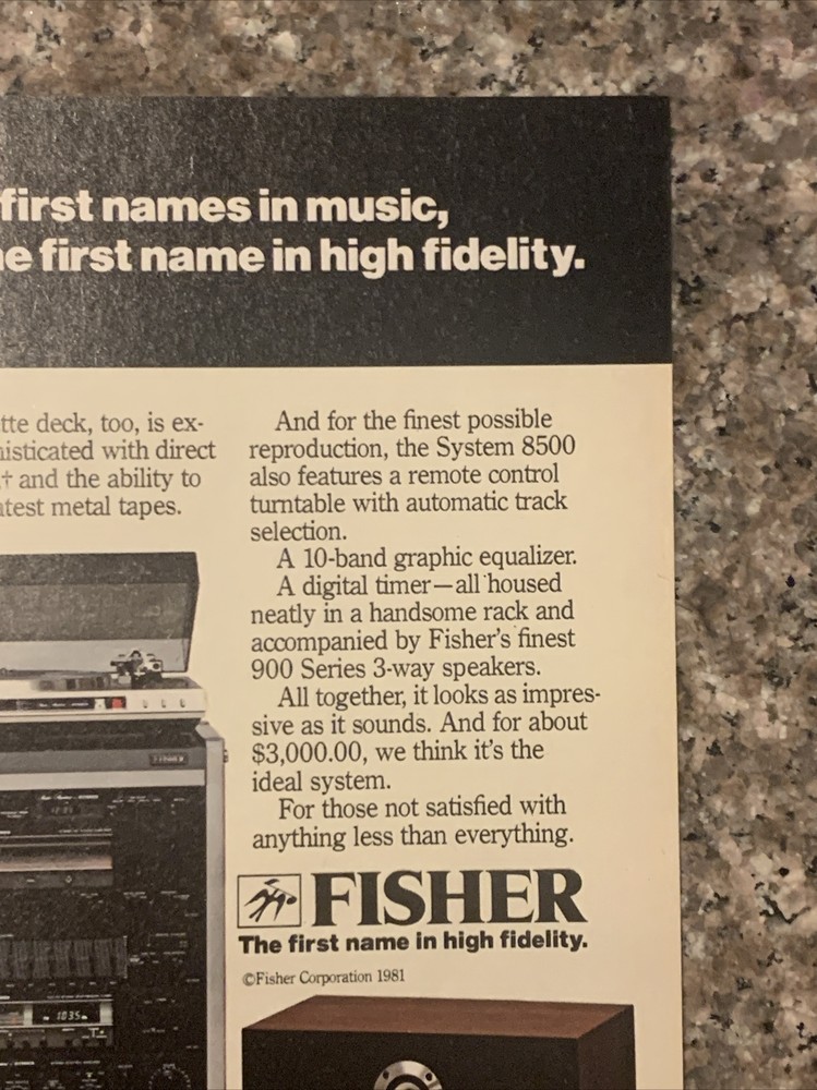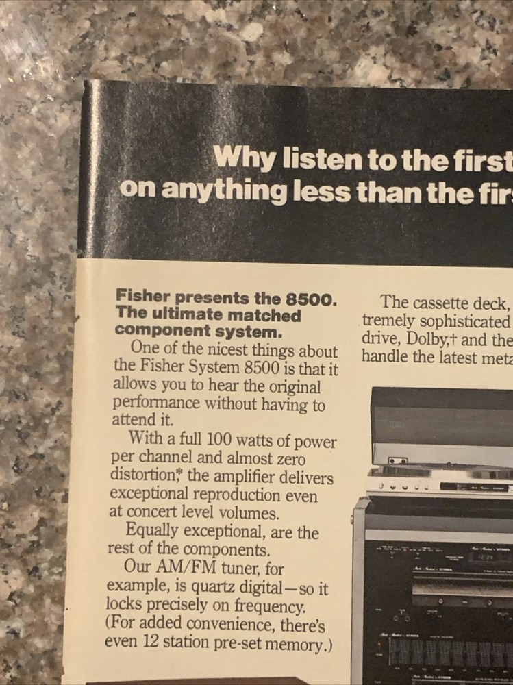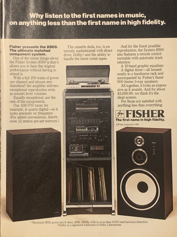 This vintage 1981 Fisher 8500 System Stereo Components magazine print ad is a must-have for any collector of advertising memorabilia. The colorful multi-image ad showcases the brand's high-quality products. Created in the United States during the 1980-89 time period, this ad is a true piece of nostalgia that will make a great addition to any collection. Original approximate 8”x11” vintage magazine print ad.