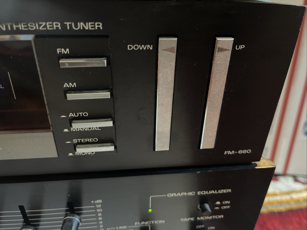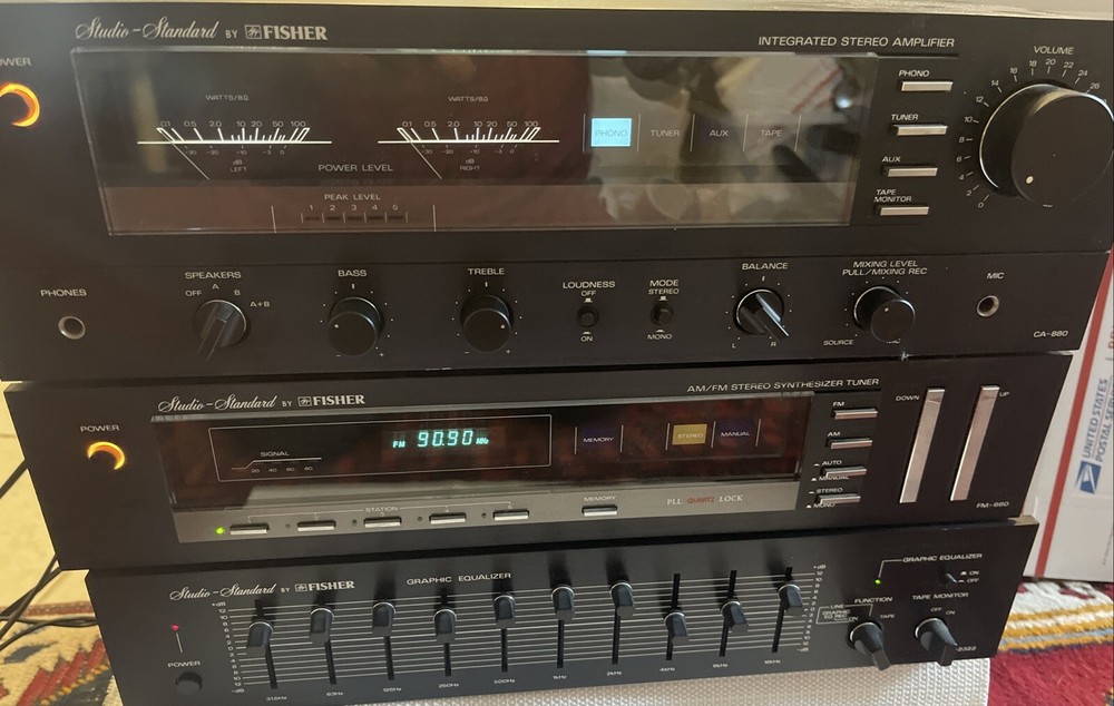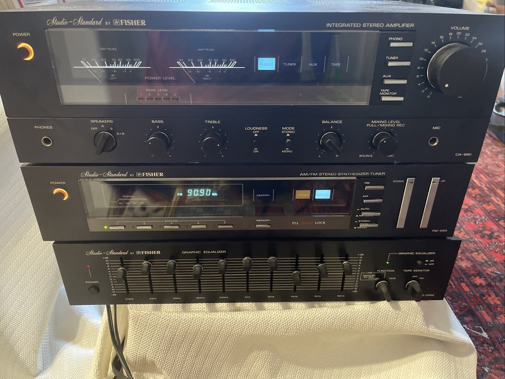 Very clean never been serviced or any issue On same shelf past 40 years Sale is for 3 pieces Included CA 880 amp Fm 660 amfm tuner And eq 2322 All in immaculate condition Clean no scratches or dings All light and functions are perfect Will have the matching turntable On our other sale Shipping is free to lower 48 states only No shipping to Hawaii Alaska, Puerto Rico, Virgin Islands, Guam shipping cost Will be extremely high Fisher CA-880 Stereo Integrated Amplifier (1981) Specifications Power output: 100 watts per channel into 8 Ω (stereo) Frequency response: 20Hz to 20kHz Total harmonic distortion: 0.09% Damping factor: 40 Input sensitivity: 1.6mV (mic), 2.5mV (MM), 150mV (line) Signal to noise ratio: 60dB (mic), 70dB (MM), 100dB (line) Output: 150mV (line) Dimensions: 17-1/3 x 13-1/2 x 5-1/4 inches Weight: 25lbs Year: 1981