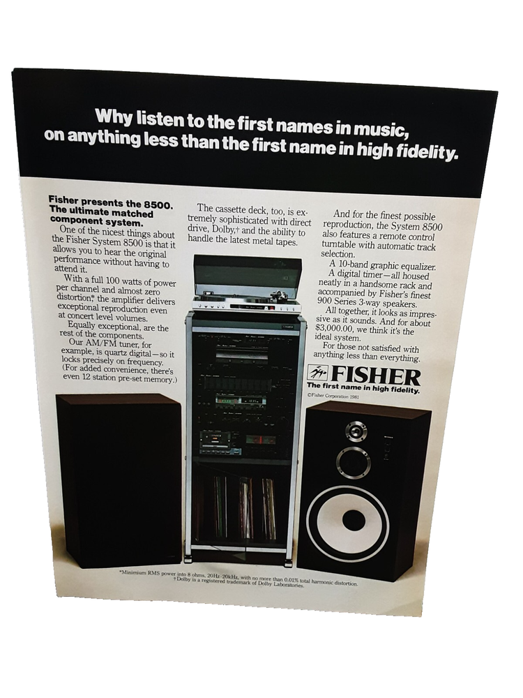1982 Fisher 8500 Stereo System original authentic vintage print ad. Cut directly from a vintage 1982 magazine. Measures approx 8x11 Good to better vintage condition. Comes with cover and backing board. "I herein make no claims to the publishing rights or copyrights of these original works. As such, the works are sold as vintage Magazine ads under the Fair Use Doctrine." “The item you are viewing is a vintage print ad. We do not sell the items that are pictured within the image itself.” Condition: Pre-Owned Good
