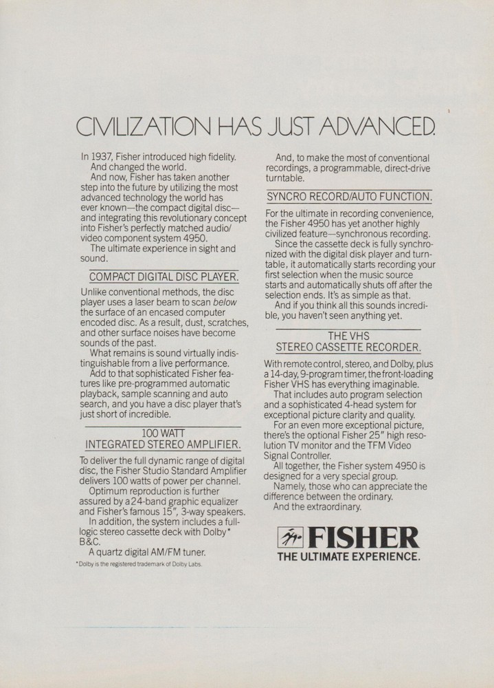 ***THIS LISTING IS FOR A COLLECTIBLE MAGAZINE AD, NOT THE ACTUAL PRODUCT SHOWN IN THE AD*** ***PLEASE READ ENTIRE DESCRIPTION*** We Only Sell 100% Original Magazine Ads, Never Copies Or Reprints. The Ad Pictured Is The Ad You Will Receive. Ads Normally Look Better Than The Scanned Photo Appears. Vintage 100% Original Magazine Print Ad 1983 Fisher Stereos This Is A 2-Page Advertisement, Two Separate Pages, Each Page Measures About 8" x 11" Will Be Shipped In A Protective Sheet And Back-Boarded I Do Offer Combined Shipping Discounts If Multiple Ads Are Purchased Together Only Pay Shipping On First One, All Additional Ads In That Order Are Free Shipping ***Save Us To Your Favorites And Check Back Often As New Listings Are Posted Daily***