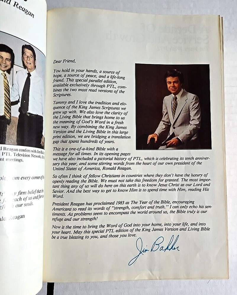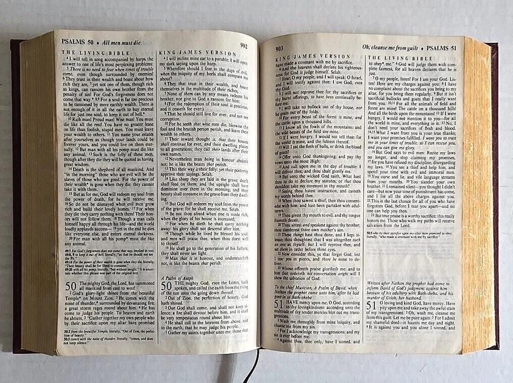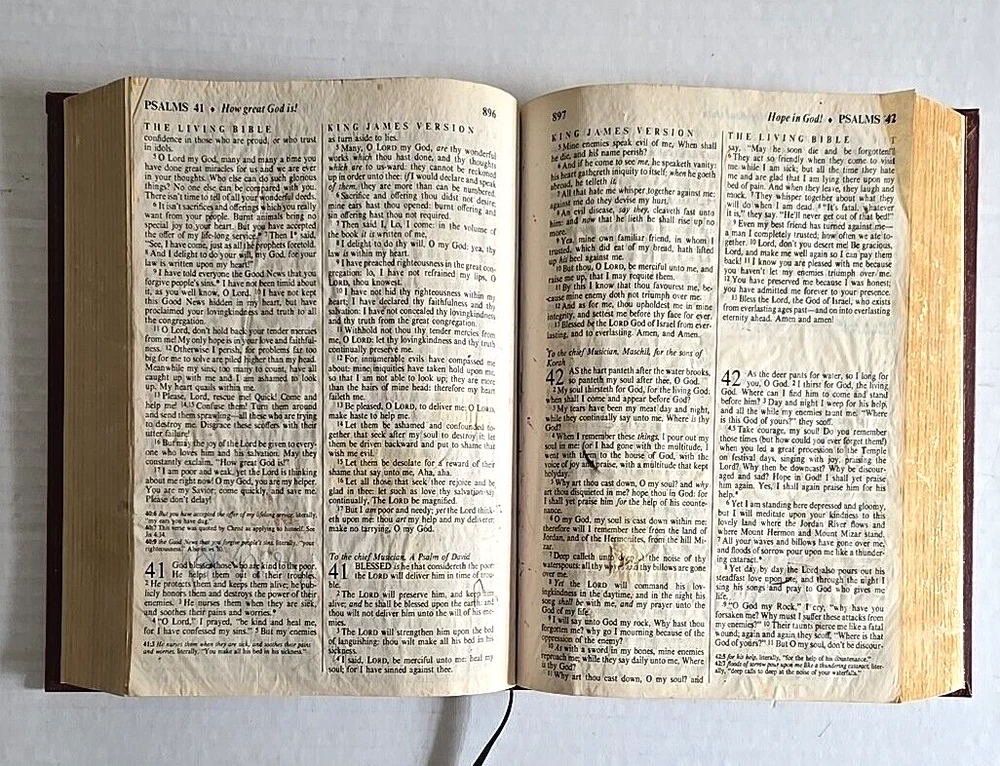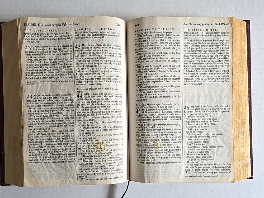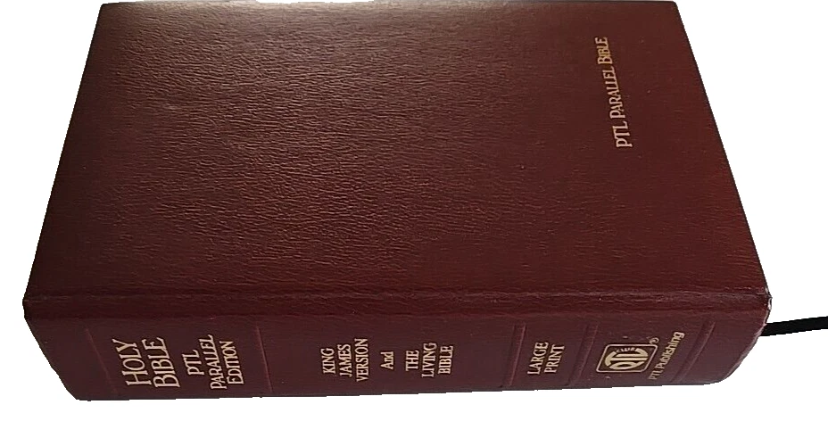 1983 PTL Parallel First Edition KJV Living Bible Large Print Padded Leather VTG Hardcover Estate Find Pre-Owned Acceptable Condition with Some Wear on Psalm Pages Chapters 37-45-& Gilding Zoo in Photos. Chapter 22 has a small rip on bottom, 37 has a tear on bottom corner, 38 & 39 have pen marks, 42 has a small hole & 43-45 have crinkled paper, about 22 Really Crinkled Pages but Most of the Book are in Good Condition. Ribbon marker. Thank you for looking!