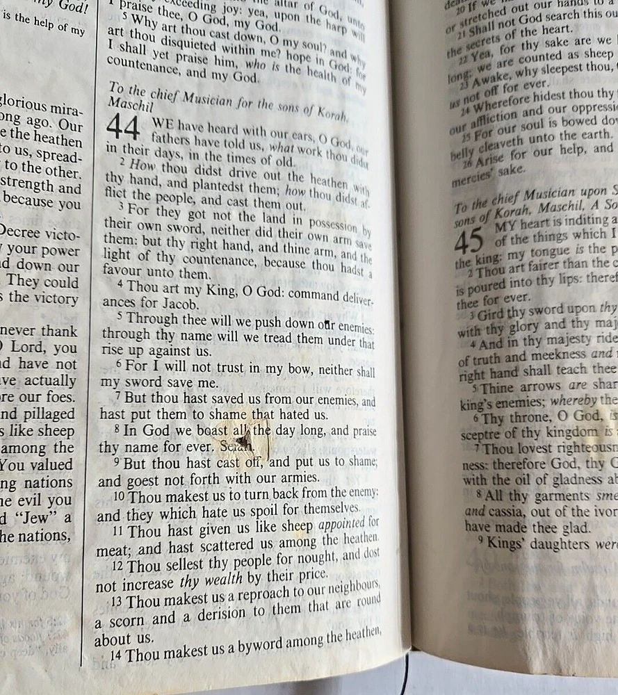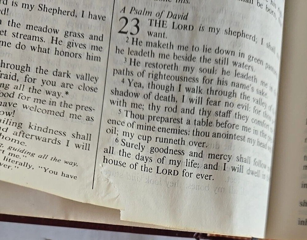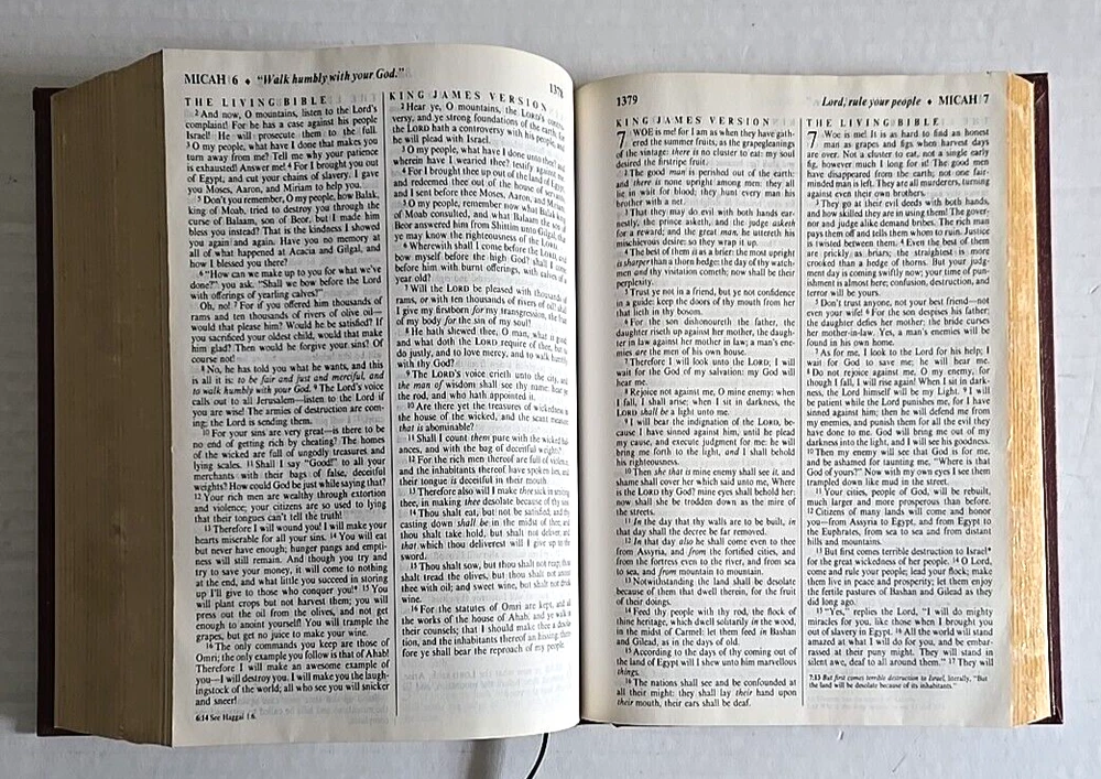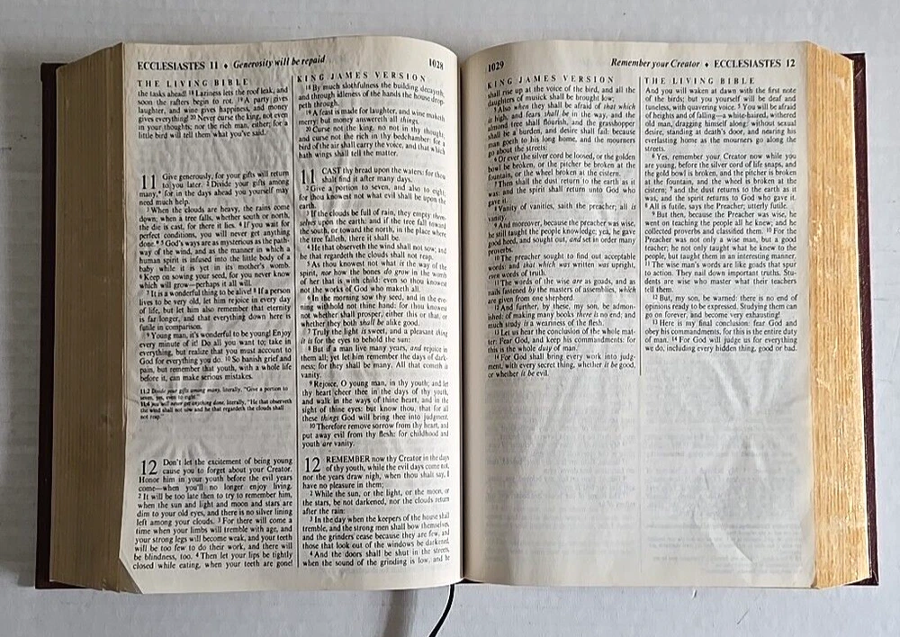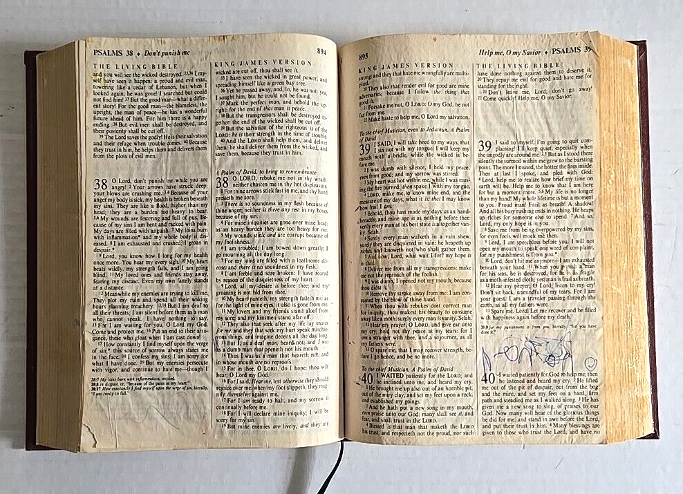 1983 PTL Parallel First Edition KJV Living Bible Large Print Padded Leather VTG Hardcover Estate Find Pre-Owned Acceptable Condition with Some Wear on Psalm Pages Chapters 37-45-& Gilding Zoo in Photos. Chapter 22 has a small rip on bottom, 37 has a tear on bottom corner, 38 & 39 have pen marks, 42 has a small hole & 43-45 have crinkled paper, about 22 Really Crinkled Pages but Most of the Book are in Good Condition. Ribbon marker. Thank you for looking!