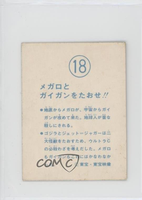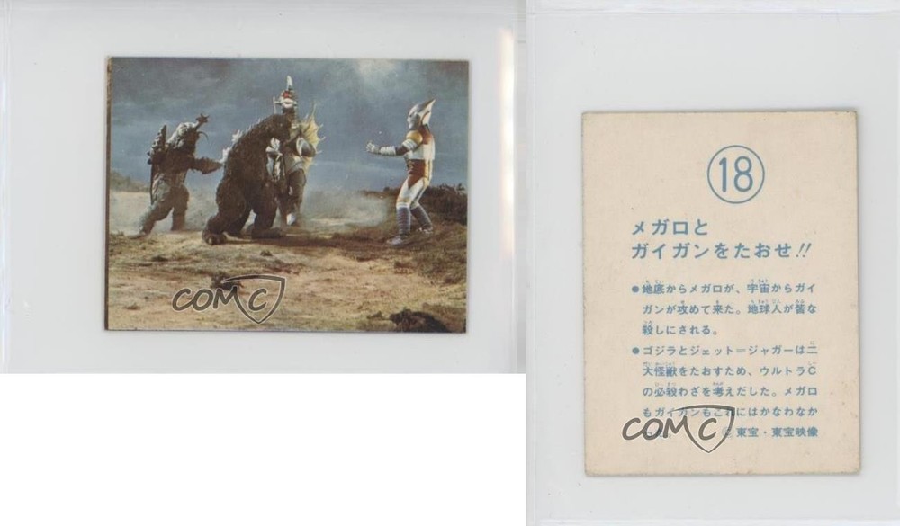 1983 Yamakatsu Godzilla Anthology - [Base] #18 Godzilla COMC Item: 248621051 - Non-Sports Card - Featuring Godzilla Search for more: 1983 Yamakatsu Godzilla Anthology Search for more: 1983 Yamakatsu Godzilla Anthology - [Base] View all of our Listings Auctions Buy It Now About Us Located in the beautiful Pacific Northwest, COMC (Check Out My Cards) is the world's largest consignment service for trading card singles. More than 10,000 people have used our consignment service to list over 50 million trading cards. Find out how we can help you consign your items on eBay by contacting us through eBay messaging. COMC -- "The Safe & Easy Way to Buy & Sell" Raw Condition for Modern Cards Unless otherwise noted, raw modern cards are listed in Near Mint-Mint condition or better. A NM-MT card appears to be Mint at first glance, but upon closer inspection, may exhibit some of the following: minor print defects (e.g. roller marks, print line, dimple), minor scratches, slight edge wear, and slight corner wear. Centering is clearly visible in the images provided and does not factor into our condition assessment. Raw Condition for Vintage Cards Unless otherwise noted, raw vintage cards are listed in Excellent condition or better. An EX card may exhibit some of the following: minor rounding of corners, surface wear, print defects, light scratches, and slight edge wear/chipping. Centering is clearly visible in the images provided and does not factor into our condition assessment. Domestic Shipping Combined shipping for multiple items is available. To receive combined shipping, please ensure all desired items are in your eBay shopping cart before proceeding to checkout. eBay limits orders to 40 items per order. We automatically combine multiple orders placed on the same day. If you place multiple orders on the same day, please contact us to request a refund of applicable shipping costs. Signature confirmation may be required on invoices over $400. All cards are protected and shipped securely. International Shipping COMC offers eBay's International Shipping (EIS) for international orders under $2,500* (see country exceptions below). All duties and import fees are paid at checkout; in the rare event that there are additional import fees upon delivery, these are borne by the buyer. EIS packages route through a shipping hub in Erlanger, KY before shipping to their final destination. Please note that EIS does not allow for combined shipments. The shipping rates are determined by eBay and cannot be adjusted. *Maximum sale price exceptions: Colombia, Kuwait ($2,000); Taiwan ($1,539); Chile, Costa Rica, Guatemala, Honduras, Trinidad and Tobago ($1,000); Antigua and Barbuda, Aruba, Belize, Dominica, Grenada, Philippines, Saint Kitts and Nevis, Saint Lucia, Montserrat, Turks and Caicos Islands ($500); Dominican Republic, El Salvador ($200). Please request a shipping quote through eBay messaging for orders that exceed the maximum sale price supported by eBay's International Shipping. You will be responsible for all duties and import fees for international orders shipped outside the EIS. All cards are protected and shipped securely. Payment COMC does not accept offers on our cards through our eBay storefront. COMC utilizes eBay’s managed payments system. If you are experiencing difficulties making a payment, please contact eBay for assistance. Return Policy Returns are only accepted on the rare occasion the item is not as described. If you are making a return, please initiate the return process through eBay so a mailing label can be provided for you. Prior to listing, our expert team carefully assessed this item to represent it accurately. Please review the description and high-definition images prior to purchasing to ensure this item meets your satisfaction. We welcome you to contact us if you have further questions about this item. Trust and Integrity COMC carefully assesses each item consigned to us to prevent fraudulent items from entering the marketplace. If you believe an item offered on COMC may be fraudulent, please contact us with details so we can investigate the issue. Items we determine are outside our supported items policy may be removed. Last Modified: 6/13/2025 11:56:37 AM PDT