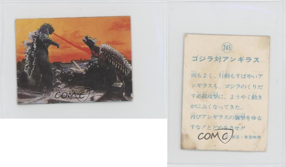 1983 Yamakatsu Godzilla Anthology - [Base] #245 Godzilla, Kamoebas COMC Item: 212871799 - Non-Sports Card - Featuring Godzilla and Kamoebas Search for more: 1983 Yamakatsu Godzilla Anthology Search for more: 1983 Yamakatsu Godzilla Anthology - [Base] View all of our Listings Auctions Buy It Now About Us Located in the beautiful Pacific Northwest, COMC (Check Out My Cards) is the world's largest consignment service for trading card singles. More than 10,000 people have used our consignment service to list over 50 million trading cards. Find out how we can help you consign your items on eBay by contacting us through eBay messaging. COMC -- "The Safe & Easy Way to Buy & Sell" Raw Condition for Modern Cards Unless otherwise noted, raw modern cards are listed in Near Mint-Mint condition or better. A NM-MT card appears to be Mint at first glance, but upon closer inspection, may exhibit some of the following: minor print defects (e.g. roller marks, print line, dimple), minor scratches, slight edge wear, and slight corner wear. Centering is clearly visible in the images provided and does not factor into our condition assessment. Raw Condition for Vintage Cards Unless otherwise noted, raw vintage cards are listed in Excellent condition or better. An EX card may exhibit some of the following: minor rounding of corners, surface wear, print defects, light scratches, and slight edge wear/chipping. Centering is clearly visible in the images provided and does not factor into our condition assessment. Domestic Shipping Combined shipping for multiple items is available. To receive combined shipping, please ensure all desired items are in your eBay shopping cart before proceeding to checkout. eBay limits orders to 40 items per order. We automatically combine multiple orders placed on the same day. If you place multiple orders on the same day, please contact us to request a refund of applicable shipping costs. Signature confirmation may be required on invoices over $400. All cards are protected and shipped securely. International Shipping COMC offers eBay's International Shipping (EIS) for international orders under $2,500* (see country exceptions below). All duties and import fees are paid at checkout; in the rare event that there are additional import fees upon delivery, these are borne by the buyer. EIS packages route through a shipping hub in Erlanger, KY before shipping to their final destination. Please note that EIS does not allow for combined shipments. The shipping rates are determined by eBay and cannot be adjusted. *Maximum sale price exceptions: Colombia, Kuwait ($2,000); Taiwan ($1,539); Chile, Costa Rica, Guatemala, Honduras, Trinidad and Tobago ($1,000); Antigua and Barbuda, Aruba, Belize, Dominica, Grenada, Philippines, Saint Kitts and Nevis, Saint Lucia, Montserrat, Turks and Caicos Islands ($500); Dominican Republic, El Salvador ($200). Please request a shipping quote through eBay messaging for orders that exceed the maximum sale price supported by eBay's International Shipping. You will be responsible for all duties and import fees for international orders shipped outside the EIS. All cards are protected and shipped securely. Payment COMC does not accept offers on our cards through our eBay storefront. COMC utilizes eBay’s managed payments system. If you are experiencing difficulties making a payment, please contact eBay for assistance. Return Policy Returns are only accepted on the rare occasion the item is not as described. If you are making a return, please initiate the return process through eBay so a mailing label can be provided for you. Prior to listing, our expert team carefully assessed this item to represent it accurately. Please review the description and high-definition images prior to purchasing to ensure this item meets your satisfaction. We welcome you to contact us if you have further questions about this item. Trust and Integrity COMC carefully assesses each item consigned to us to prevent fraudulent items from entering the marketplace. If you believe an item offered on COMC may be fraudulent, please contact us with details so we can investigate the issue. Items we determine are outside our supported items policy may be removed. Last Modified: 6/12/2025 6:43:30 AM PDT