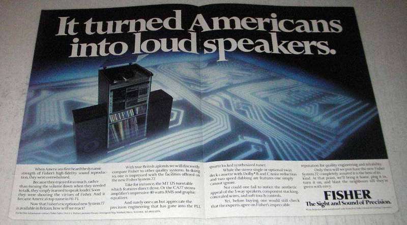 Item ID: BW0519 This listing is for a vintage paper advertisement. This is a 1984 2-page Centerfold ad for a Fisher System 77 Hi-Fi Stereo! The size of the ad is approximately 11x17inches. The caption for this ad is 'It turned Americans into loud speakers' The ad is in good overall condition, with a light center crease on each page. This vintage ad would look great framed and displayed! Add it to your collection today!