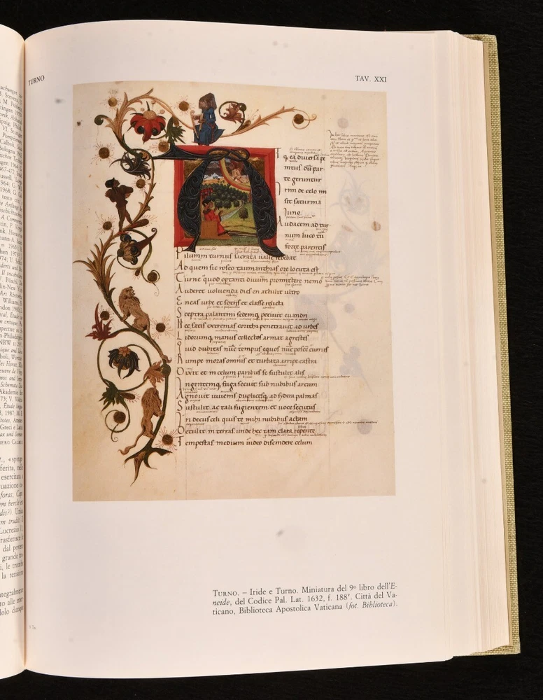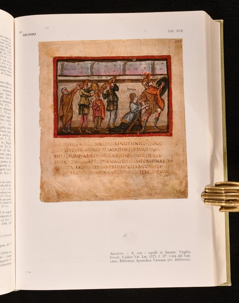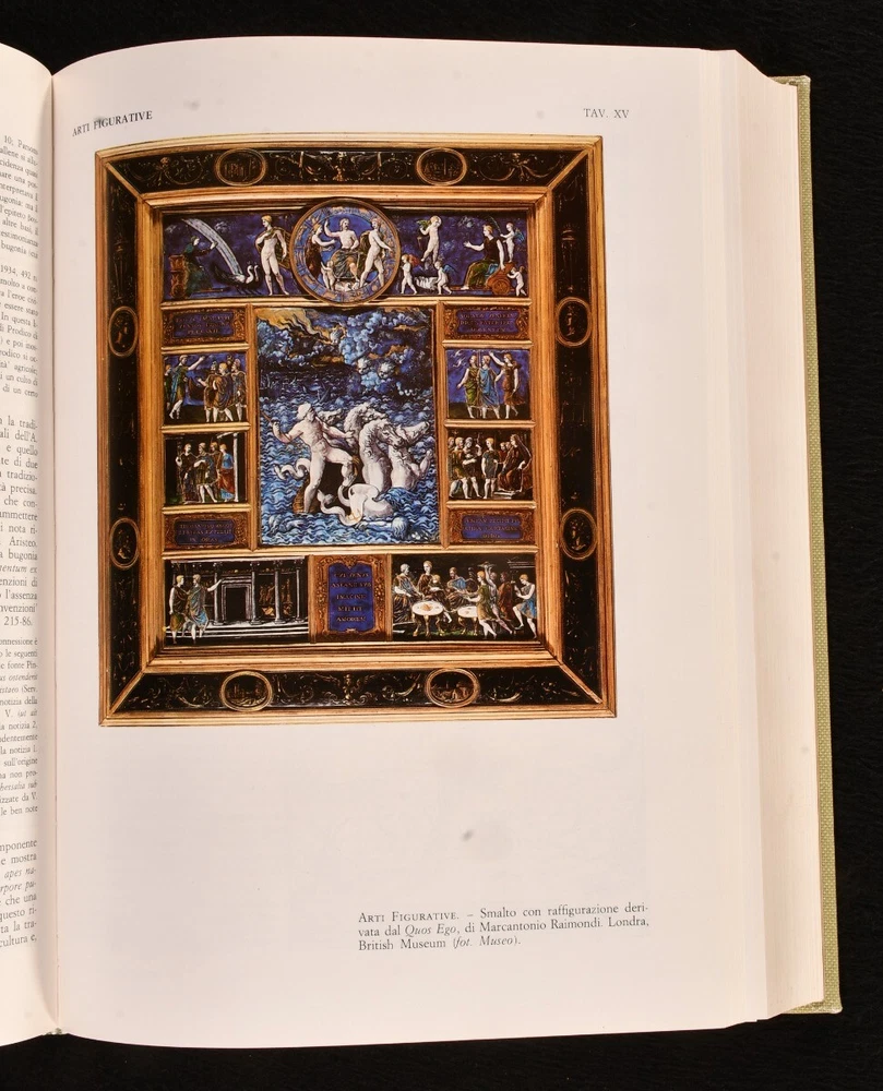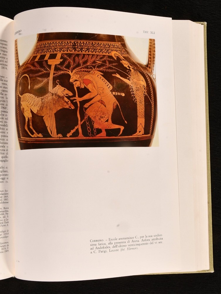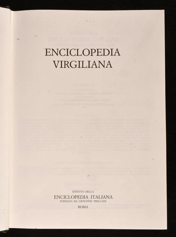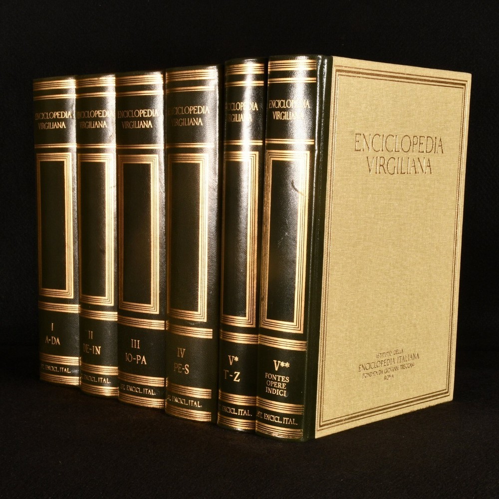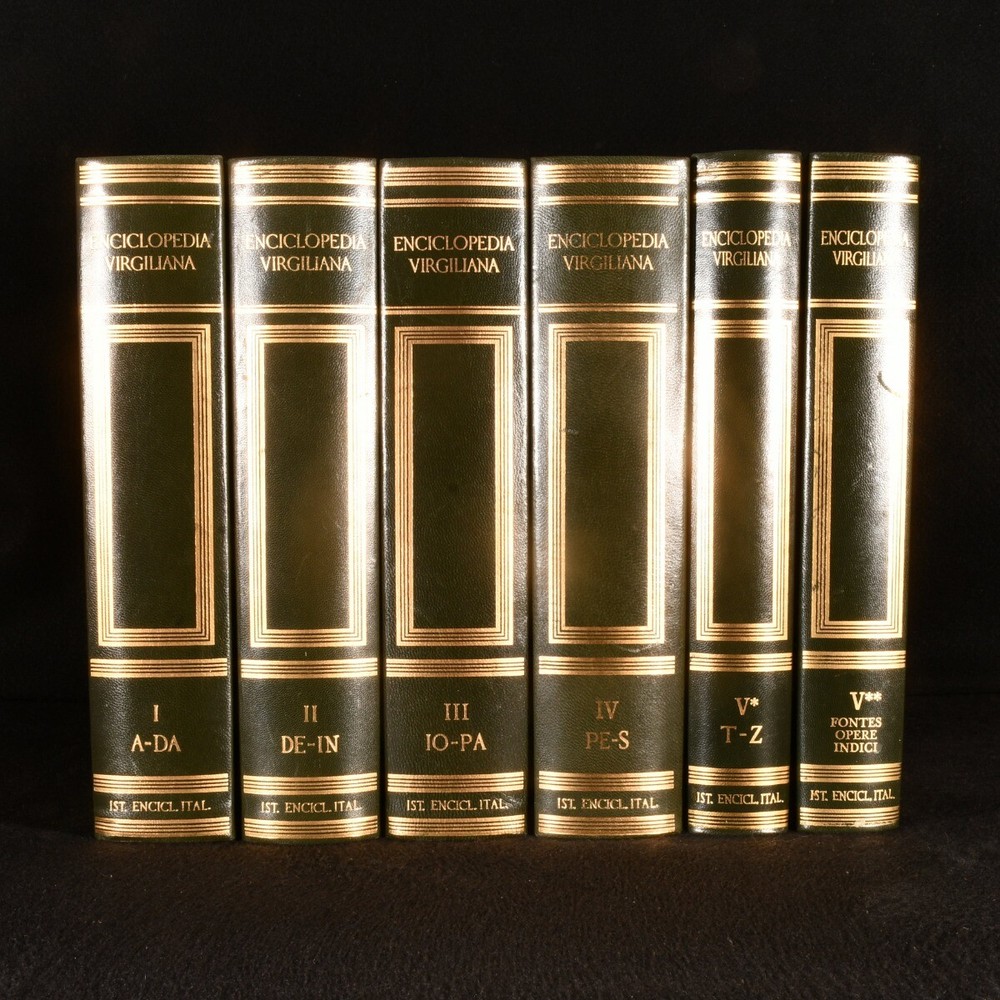 Click here to see our other books! Enciclopedia Virgiliana Various 1984-90 Istituto della Enciclopedia Italiana : Roma 11" by 8" xxi [3], 1005; xx, 1005; xx, 1038; xx, 1103; xx, 661; xix, 623pp. SUMMARY A beautiful six-volume large paper edition of this comprehensive Virgilian Encyclopaedia in the original Italian, a scarce work. Colour Plates,Illustrated,Leather Binding,Publishers' Original Binding,Scarce Overall Condition: Fine This book weighs 30 KG when packed UK Postage: £ 4.49 US Postage: £ 99.99 EU Postage : £ 49.99 European Postage: £ 99.99 Asia Postage: £ 187.99 Worldwide Postage: £ 276.99 DESCRIPTION Complete in six volumes. A scarce work, rarely seen on the market. A beautiful comprehensive encyclopaedic study dedicated to the work and times of Publio Virgilio Marone (Virgil), covering subjects from A to Z. In the original Italian language. Published by the Istituto della Enciclopedia Italiana founded by Giovanni Treccani, former Senator of Italy and famous publisher of the Enciclopedia Italiana di scienze, lettere ed arti and of the Dizionario Biografico degli Italiani . A great guide to the critical-hermeneutic study of the work of Virgil, as well as a support to extend the knowledge of his world. Volume VI contains an extensive Index. In the original publisher's striking quarter morocco bindings. Each volume illustrated with numerous black and white illustrations in text as well as lovely colourful plates. With fifty-two full page plates to vol. I; sixty to vol. II; sixty-four to vol. III; sixty-four to vol. IV; forty-four to vol. V; forty-eight to vol. VI with five coloured maps to rear. Collated, complete. CONDITION In the original publisher's uniform quarter morocco bindings over cloth covered boards. Externally lovely. Internally, firmly bound. Pages bright and clean. Overall Condition: Fine GLOSSARY OF TERMS Overall Condition (Dustwrapper condition rating is shown after that for the book itself, where a dustwrapper is present) Fine - Very well preserved copy showing very little wear Very Good Indeed - Only one or two minor faults, really a very attractive copy Very Good - Quite a wide term meaning no major faults but probably several smaller ones often expected given the age of the book, but still a respectable copy Good - Meaning not very good. Some more serious faults as will be described in the condition report under 'condition' Good Only - Meaning one or more faults that could really do with repair Fair - As with good only above but with other faults leaving a compromised copy even after repair Poor - Really bad and possibly seriously incomplete. We only sell books in this condition where their rarity or value makes them attractive none the less. Major defects will be described. GUARANTEE We offer a full money back guarantee on our descriptions. Please ask for details and conditions. We prefer PAYPAL. If you pay via PAYPAL we will post the item off the same or the next working day with the postage you have selected. Please note we cannot accept USD cheques