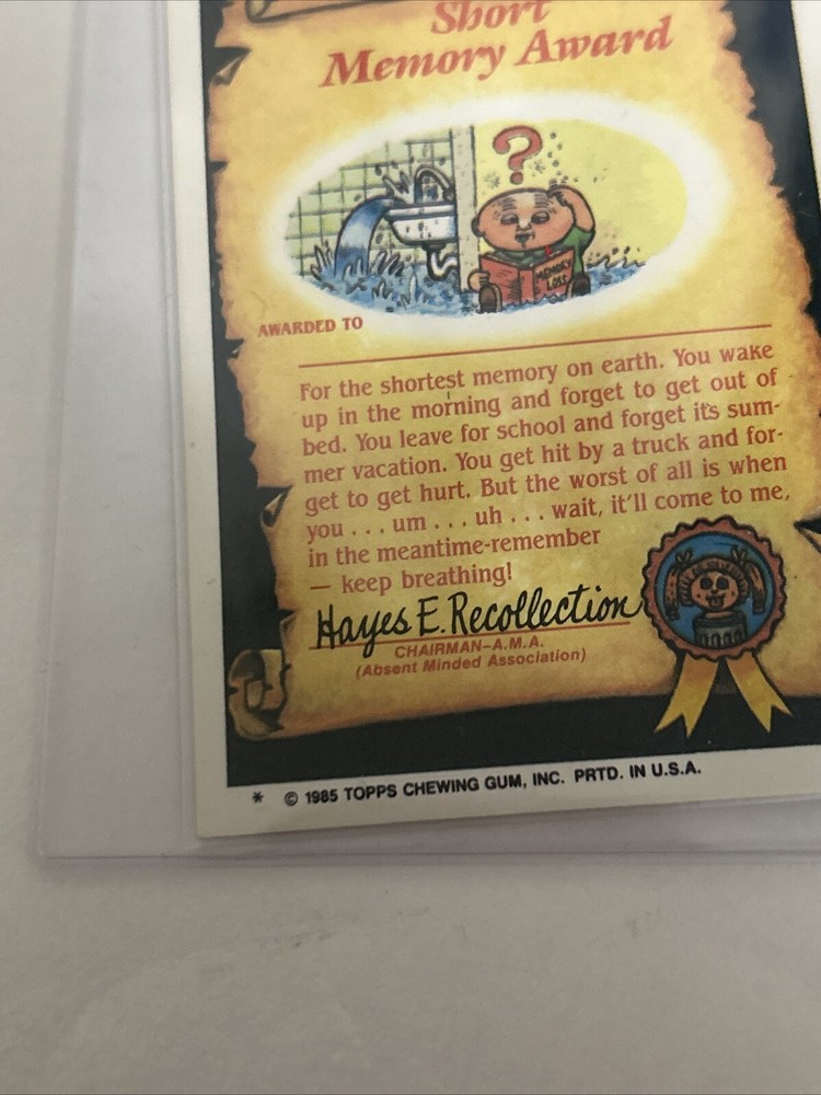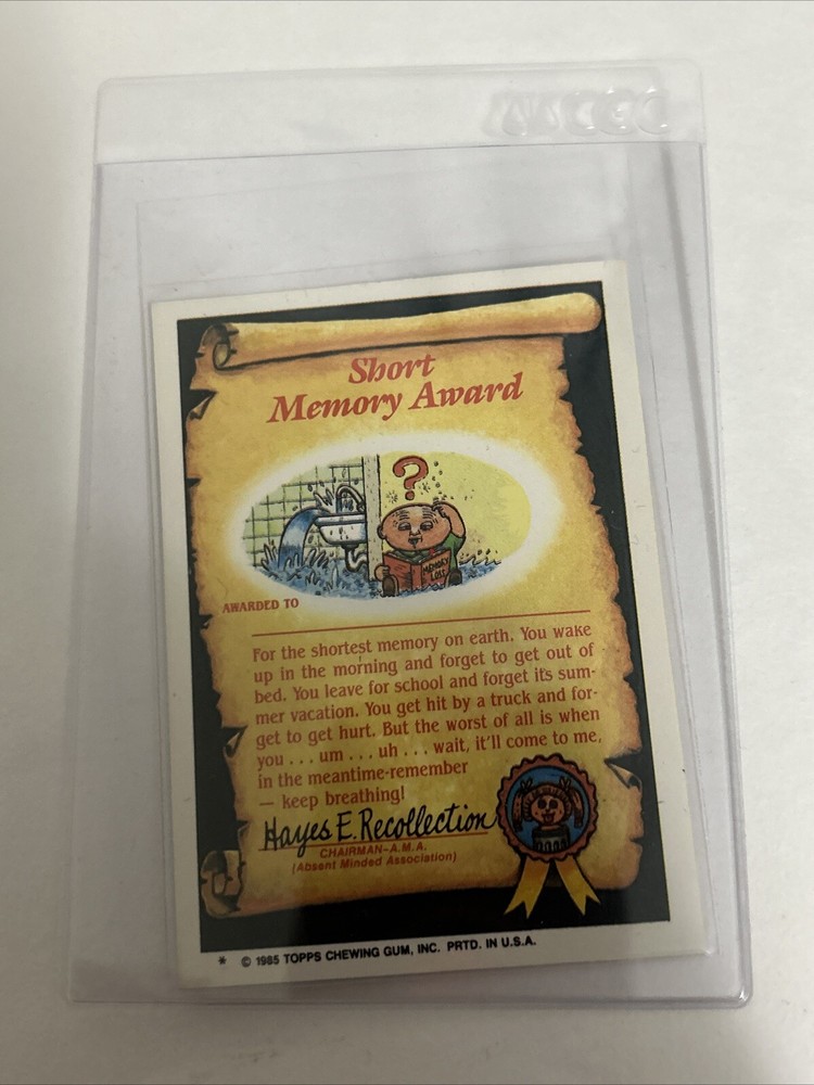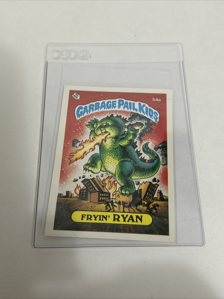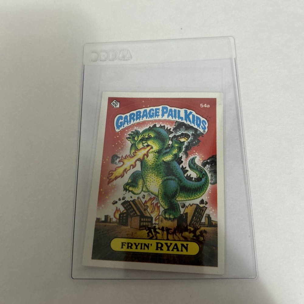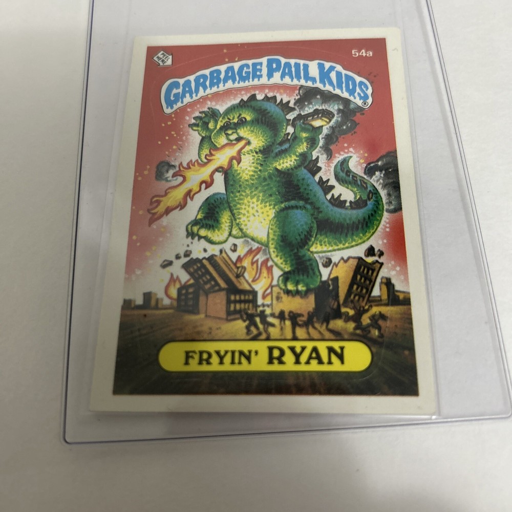 1985 Topps Garbage Pail Kids trading card features Fryin Ryan 54a. The card was manufactured in 1985 and includes a sticker of the iconic parody of Godzilla character. Card has minor tear and wear and is in good condition, it includes the sleeves shown in pictures, thanks for watching.