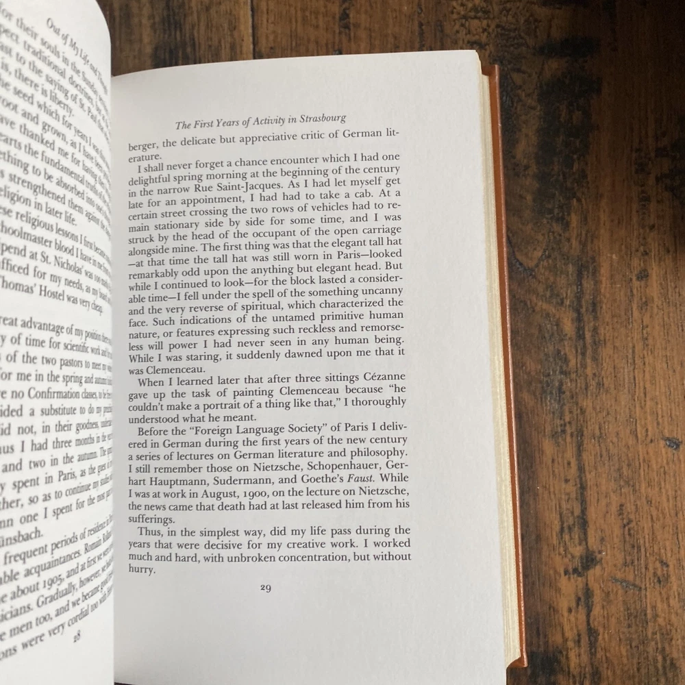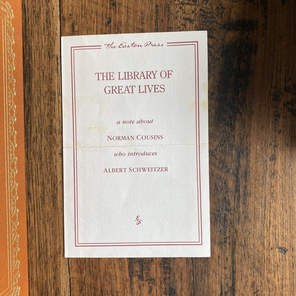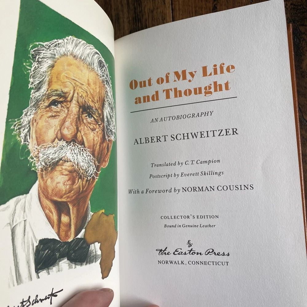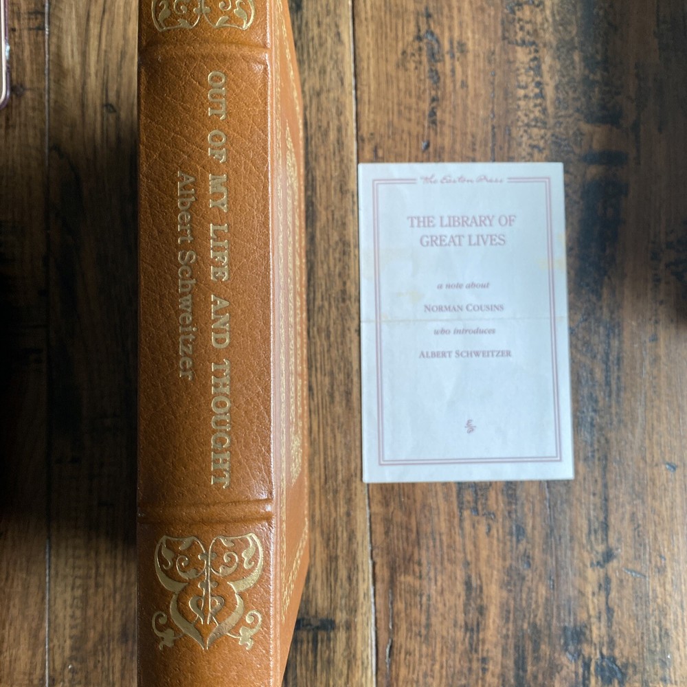 1989 Easton Press~Out Of My Life And Thought~Albert Schweitzer~Great Lives. A bit of leather wear along spine front cover (pic) - VG+ shape all around - bright pages - gilt intact - no marks nor writi...