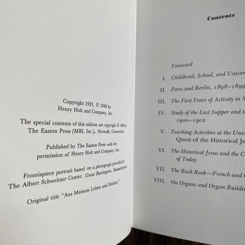 1989 Easton Press~Out Of My Life And Thought~Albert Schweitzer~Great Lives. A bit of leather wear along spine front cover (pic) - VG+ shape all around - bright pages - gilt intact - no marks nor writing - strong binding - please see pics