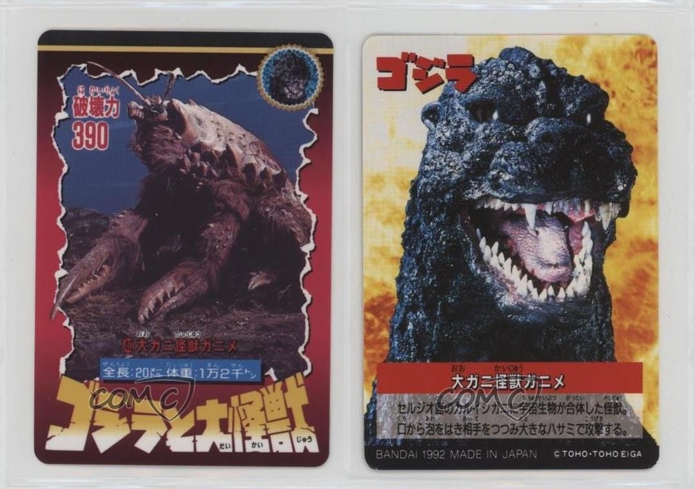 1992 Bandai Godzilla and the Great Kaiju - [Base] #40 Ebirah COMC Item: 257726782 - Non-Sports Card - Featuring Ebirah Search for more: 1992 Bandai Godzilla and the Great Kaiju Search for more: 1992 Bandai Godzilla and the Great Kaiju - [Base] View all of our Listings Auctions Buy It Now About Us Located in the beautiful Pacific Northwest, COMC (Check Out My Cards) is the world's largest consignment service for trading card singles. More than 10,000 people have used our consignment service to list over 50 million trading cards. Find out how we can help you consign your items on eBay by contacting us through eBay messaging. COMC -- "The Safe & Easy Way to Buy & Sell" Raw Condition for Modern Cards Unless otherwise noted, raw modern cards are listed in Near Mint-Mint condition or better. A NM-MT card appears to be Mint at first glance, but upon closer inspection, may exhibit some of the following: minor print defects (e.g. roller marks, print line, dimple), minor scratches, slight edge wear, and slight corner wear. Centering is clearly visible in the images provided and does not factor into our condition assessment. Raw Condition for Vintage Cards Unless otherwise noted, raw vintage cards are listed in Excellent condition or better. An EX card may exhibit some of the following: minor rounding of corners, surface wear, print defects, light scratches, and slight edge wear/chipping. Centering is clearly visible in the images provided and does not factor into our condition assessment. Domestic Shipping Combined shipping for multiple items is available. To receive combined shipping, please ensure all desired items are in your eBay shopping cart before proceeding to checkout. eBay limits orders to 40 items per order. We automatically combine multiple orders placed on the same day. If you place multiple orders on the same day, please contact us to request a refund of applicable shipping costs. Signature confirmation may be required on invoices over $400. All cards are protected and shipped securely. International Shipping COMC offers eBay's International Shipping (EIS) for international orders under $2,500* (see country exceptions below). All duties and import fees are paid at checkout; in the rare event that there are additional import fees upon delivery, these are borne by the buyer. EIS packages route through a shipping hub in Erlanger, KY before shipping to their final destination. Please note that EIS does not allow for combined shipments. The shipping rates are determined by eBay and cannot be adjusted. *Maximum sale price exceptions: Colombia, Kuwait ($2,000); Taiwan ($1,539); Chile, Costa Rica, Guatemala, Honduras, Trinidad and Tobago ($1,000); Antigua and Barbuda, Aruba, Belize, Dominica, Grenada, Philippines, Saint Kitts and Nevis, Saint Lucia, Montserrat, Turks and Caicos Islands ($500); Dominican Republic, El Salvador ($200). Please request a shipping quote through eBay messaging for orders that exceed the maximum sale price supported by eBay's International Shipping. You will be responsible for all duties and import fees for international orders shipped outside the EIS. All cards are protected and shipped securely. Payment COMC does not accept offers on our cards through our eBay storefront. COMC utilizes eBay’s managed payments system. If you are experiencing difficulties making a payment, please contact eBay for assistance. Return Policy Returns are only accepted on the rare occasion the item is not as described. If you are making a return, please initiate the return process through eBay so a mailing label can be provided for you. Prior to listing, our expert team carefully assessed this item to represent it accurately. Please review the description and high-definition images prior to purchasing to ensure this item meets your satisfaction. We welcome you to contact us if you have further questions about this item. Trust and Integrity COMC carefully assesses each item consigned to us to prevent fraudulent items from entering the marketplace. If you believe an item offered on COMC may be fraudulent, please contact us with details so we can investigate the issue. Items we determine are outside our supported items policy may be removed. Last Modified: 5/21/2025 7:01:18 PM PDT
