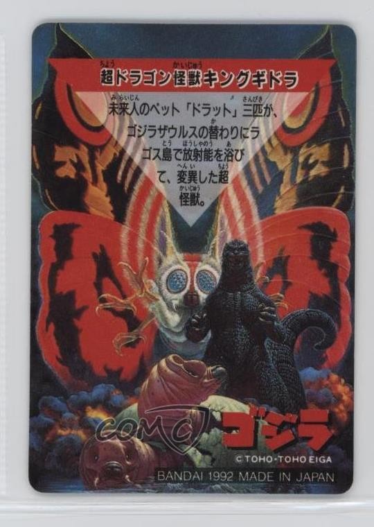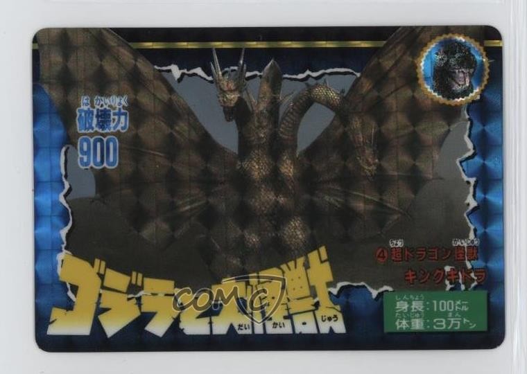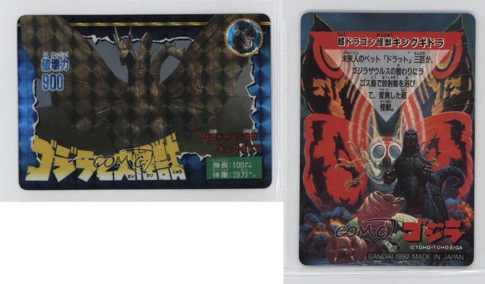1992 Bandai Godzilla and the Great Kaiju - [Base] #4 King Ghidorah COMC Item: 202037351 - Non-Sports Card - Featuring King Ghidorah Search for more: 1992 Bandai Godzilla and the Great Kaiju Search for more: 1992 Bandai Godzilla and the Great Kaiju - [Base] View all of our Listings Auctions Buy It Now About Us Located in the beautiful Pacific Northwest, COMC (Check Out My Cards) is the world's largest consignment service for trading card singles. More than 10,000 people have used our consignment service to list over 50 million trading cards. Find out how we can help you consign your items on eBay by contacting us through eBay messaging. COMC -- "The Safe & Easy Way to Buy & Sell" Raw Condition for Modern Cards Unless otherwise noted, raw modern cards are listed in Near Mint-Mint condition or better. A NM-MT card appears to be Mint at first glance, but upon closer inspection, may exhibit some of the following: minor print defects (e.g. roller marks, print line, dimple), minor scratches, slight edge wear, and slight corner wear. Centering is clearly visible in the images provided and does not factor into our condition assessment. Raw Condition for Vintage Cards Unless otherwise noted, raw vintage cards are listed in Excellent condition or better. An EX card may exhibit some of the following: minor rounding of corners, surface wear, print defects, light scratches, and slight edge wear/chipping. Centering is clearly visible in the images provided and does not factor into our condition assessment. Domestic Shipping Combined shipping for multiple items is available. To receive combined shipping, please ensure all desired items are in your eBay shopping cart before proceeding to checkout. eBay limits orders to 40 items per order. We automatically combine multiple orders placed on the same day. If you place multiple orders on the same day, please contact us to request a refund of applicable shipping costs. Signature confirmation may be required on invoices over $400. All cards are protected and shipped securely. International Shipping COMC offers eBay's International Shipping (EIS) for international orders under $2,500* (see country exceptions below). All duties and import fees are paid at checkout; in the rare event that there are additional import fees upon delivery, these are borne by the buyer. EIS packages route through a shipping hub in Erlanger, KY before shipping to their final destination. Please note that EIS does not allow for combined shipments. The shipping rates are determined by eBay and cannot be adjusted. *Maximum sale price exceptions: Colombia, Kuwait ($2,000); Taiwan ($1,539); Chile, Costa Rica, Guatemala, Honduras, Trinidad and Tobago ($1,000); Antigua and Barbuda, Aruba, Belize, Dominica, Grenada, Philippines, Saint Kitts and Nevis, Saint Lucia, Montserrat, Turks and Caicos Islands ($500); Dominican Republic, El Salvador ($200). Please request a shipping quote through eBay messaging for orders that exceed the maximum sale price supported by eBay's International Shipping. You will be responsible for all duties and import fees for international orders shipped outside the EIS. All cards are protected and shipped securely. Payment COMC does not accept offers on our cards through our eBay storefront. COMC utilizes eBay’s managed payments system. If you are experiencing difficulties making a payment, please contact eBay for assistance. Return Policy Returns are only accepted on the rare occasion the item is not as described. If you are making a return, please initiate the return process through eBay so a mailing label can be provided for you. Prior to listing, our expert team carefully assessed this item to represent it accurately. Please review the description and high-definition images prior to purchasing to ensure this item meets your satisfaction. We welcome you to contact us if you have further questions about this item. Trust and Integrity COMC carefully assesses each item consigned to us to prevent fraudulent items from entering the marketplace. If you believe an item offered on COMC may be fraudulent, please contact us with details so we can investigate the issue. Items we determine are outside our supported items policy may be removed. Last Modified: 5/27/2025 12:53:53 AM PDT