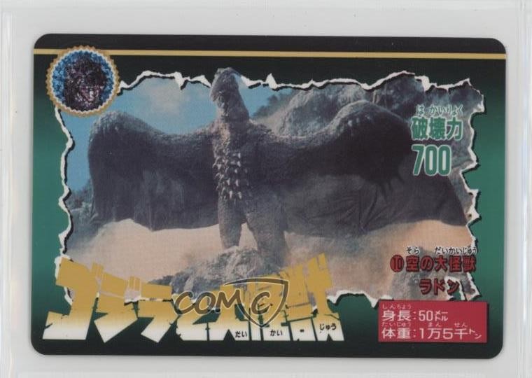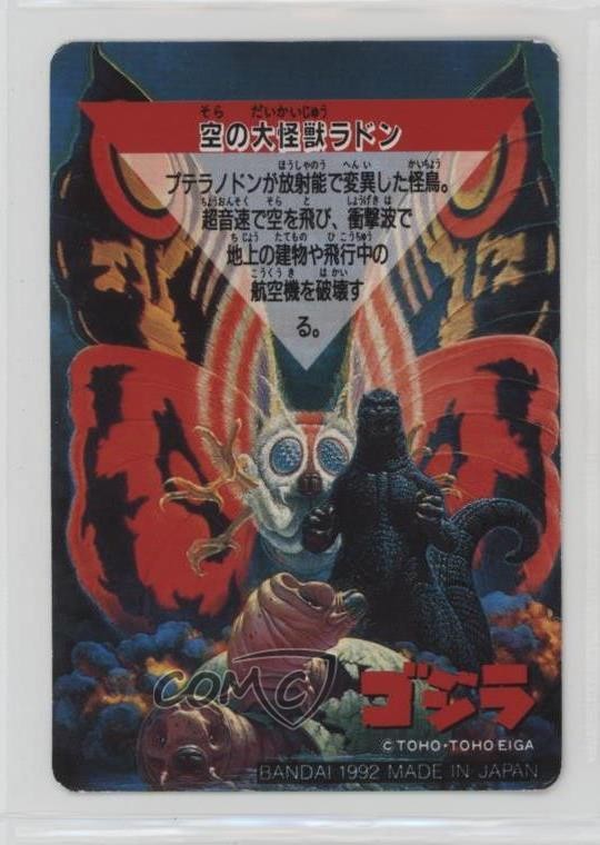 1992 Bandai Godzilla and the Great Kaiju - [Base] #10 Rodan COMC Item: 257726725 - Non-Sports Card - Featuring Rodan Search for more: 1992 Bandai Godzilla and the Great Kaiju Search for more: 1992 Bandai Godzilla and the Great Kaiju - [Base] View all of our Listings Auctions Buy It Now About Us Located in the beautiful Pacific Northwest, COMC (Check Out My Cards) is the world's largest consignment service for trading card singles. More than 10,000 people have used our consignment service to list over 50 million trading cards. Find out how we can help you consign your items on eBay by contacting us through eBay messaging. COMC -- "The Safe & Easy Way to Buy & Sell" Raw Condition for Modern Cards Unless otherwise noted, raw modern cards are listed in Near Mint-Mint condition or better. A NM-MT card appears to be Mint at first glance, but upon closer inspection, may exhibit some of the following: minor print defects (e.g. roller marks, print line, dimple), minor scratches, slight edge wear, and slight corner wear. Centering is clearly visible in the images provided and does not factor into our condition assessment. Raw Condition for Vintage Cards Unless otherwise noted, raw vintage cards are listed in Excellent condition or better. An EX card may exhibit some of the following: minor rounding of corners, surface wear, print defects, light scratches, and slight edge wear/chipping. Centering is clearly visible in the images provided and does not factor into our condition assessment. Domestic Shipping Combined shipping for multiple items is available. To receive combined shipping, please ensure all desired items are in your eBay shopping cart before proceeding to checkout. eBay limits orders to 40 items per order. We automatically combine multiple orders placed on the same day. If you place multiple orders on the same day, please contact us to request a refund of applicable shipping costs. Signature confirmation may be required on invoices over $400. All cards are protected and shipped securely. International Shipping COMC offers eBay's International Shipping (EIS) for international orders under $2,500* (see country exceptions below). All duties and import fees are paid at checkout; in the rare event that there are additional import fees upon delivery, these are borne by the buyer. EIS packages route through a shipping hub in Erlanger, KY before shipping to their final destination. Please note that EIS does not allow for combined shipments. The shipping rates are determined by eBay and cannot be adjusted. *Maximum sale price exceptions: Colombia, Kuwait ($2,000); Taiwan ($1,539); Chile, Costa Rica, Guatemala, Honduras, Trinidad and Tobago ($1,000); Antigua and Barbuda, Aruba, Belize, Dominica, Grenada, Philippines, Saint Kitts and Nevis, Saint Lucia, Montserrat, Turks and Caicos Islands ($500); Dominican Republic, El Salvador ($200). Please request a shipping quote through eBay messaging for orders that exceed the maximum sale price supported by eBay's International Shipping. You will be responsible for all duties and import fees for international orders shipped outside the EIS. All cards are protected and shipped securely. Payment COMC does not accept offers on our cards through our eBay storefront. COMC utilizes eBay’s managed payments system. If you are experiencing difficulties making a payment, please contact eBay for assistance. Return Policy Returns are only accepted on the rare occasion the item is not as described. If you are making a return, please initiate the return process through eBay so a mailing label can be provided for you. Prior to listing, our expert team carefully assessed this item to represent it accurately. Please review the description and high-definition images prior to purchasing to ensure this item meets your satisfaction. We welcome you to contact us if you have further questions about this item. Trust and Integrity COMC carefully assesses each item consigned to us to prevent fraudulent items from entering the marketplace. If you believe an item offered on COMC may be fraudulent, please contact us with details so we can investigate the issue. Items we determine are outside our supported items policy may be removed. Last Modified: 6/30/2025 7:45:30 PM PDT