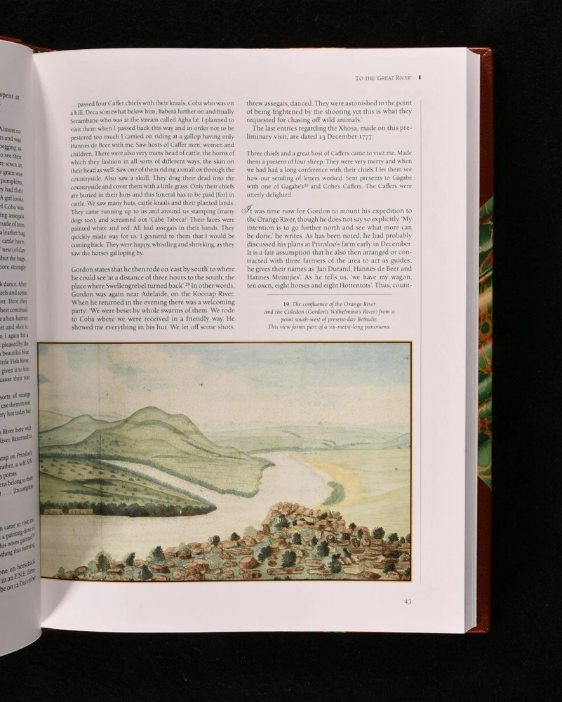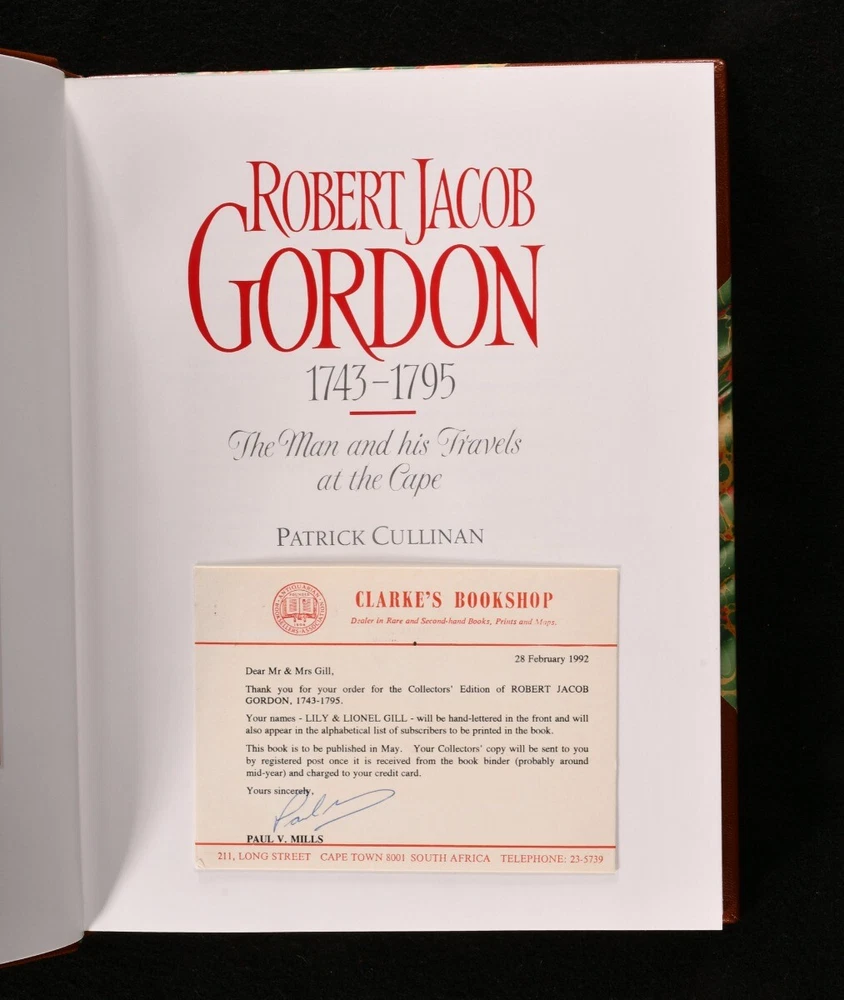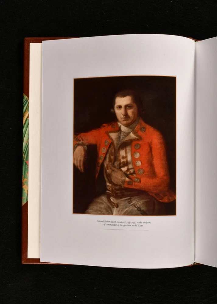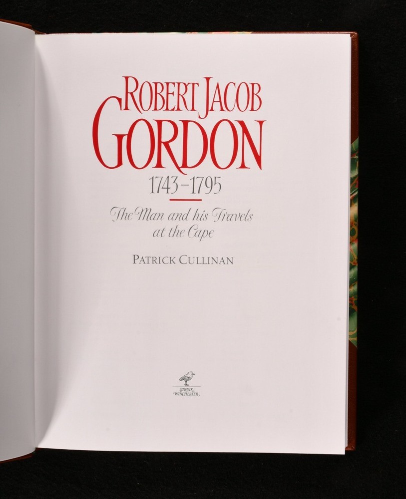Click here to see our other books! Robert Jacob Gordon 1743-1795: the Man and his Travels at the Cape Patrick Cullinan 1992 Struik : Winchester 12.5" by 9.5" 215pp SUMMARY One of 150 limited editions of this biography of Dutch explorer Robert Jacob Gordon, signed by the author. Colour Plates,Illustrated,Leather Binding,Signed,With Slipcase Overall Condition: As New This book weighs 3 KG when packed UK Postage: £ 3.99 US Postage: £ 36.99 EU Postage : £ 25.99 European Postage: £ 27.99 Asia Postage: £ 47.99 Worldwide Postage: £ 69.99 DESCRIPTION Robert Jacob Gordon (1743-1795) was an explorer, linguist, solider and naturalist. He made his first journey to the Cape Colony in 1772, and returned as captain in 1777. He was responsible for defending the Cape, and upon a British invasion subsequent to France's invasion of the Netherlands, he complied with the British, leading to accusations of treason by his soliders. Gordon committed suicide as a result of becoming an outcast. This is a limited edition, volume forty-seven of one hundred and fifty, and is presented in a slipcase with a portrait of the subject on it. The book is in a lovely half crushed morocco binding with bright marbled boards. Profusely illustrated throughout with vignette and full plate illustrations in colour and black and white. CONDITION In a half crushed morocco binding with slipcase. Externally lovely. Slipcase has minor wear to the boards. Internally firmly bound, pages bright and clean. Overall Condition: As New GLOSSARY OF TERMS Overall Condition (Dustwrapper condition rating is shown after that for the book itself, where a dustwrapper is present) Fine - Very well preserved copy showing very little wear Very Good Indeed - Only one or two minor faults, really a very attractive copy Very Good - Quite a wide term meaning no major faults but probably several smaller ones often expected given the age of the book, but still a respectable copy Good - Meaning not very good. Some more serious faults as will be described in the condition report under 'condition' Good Only - Meaning one or more faults that could really do with repair Fair - As with good only above but with other faults leaving a compromised copy even after repair Poor - Really bad and possibly seriously incomplete. We only sell books in this condition where their rarity or value makes them attractive none the less. Major defects will be described. GUARANTEE We offer a full money back guarantee on our descriptions. Please ask for details and conditions. We prefer PAYPAL. If you pay via PAYPAL we will post the item off the same or the next working day with the postage you have selected. Please note we cannot accept USD cheques