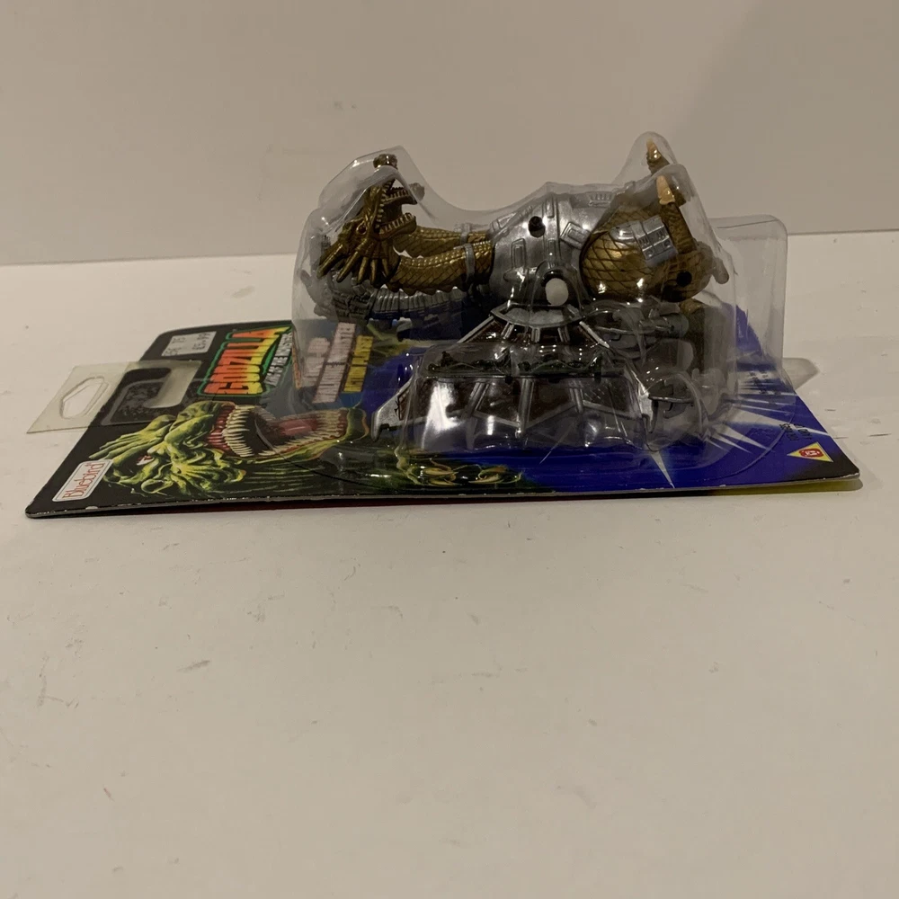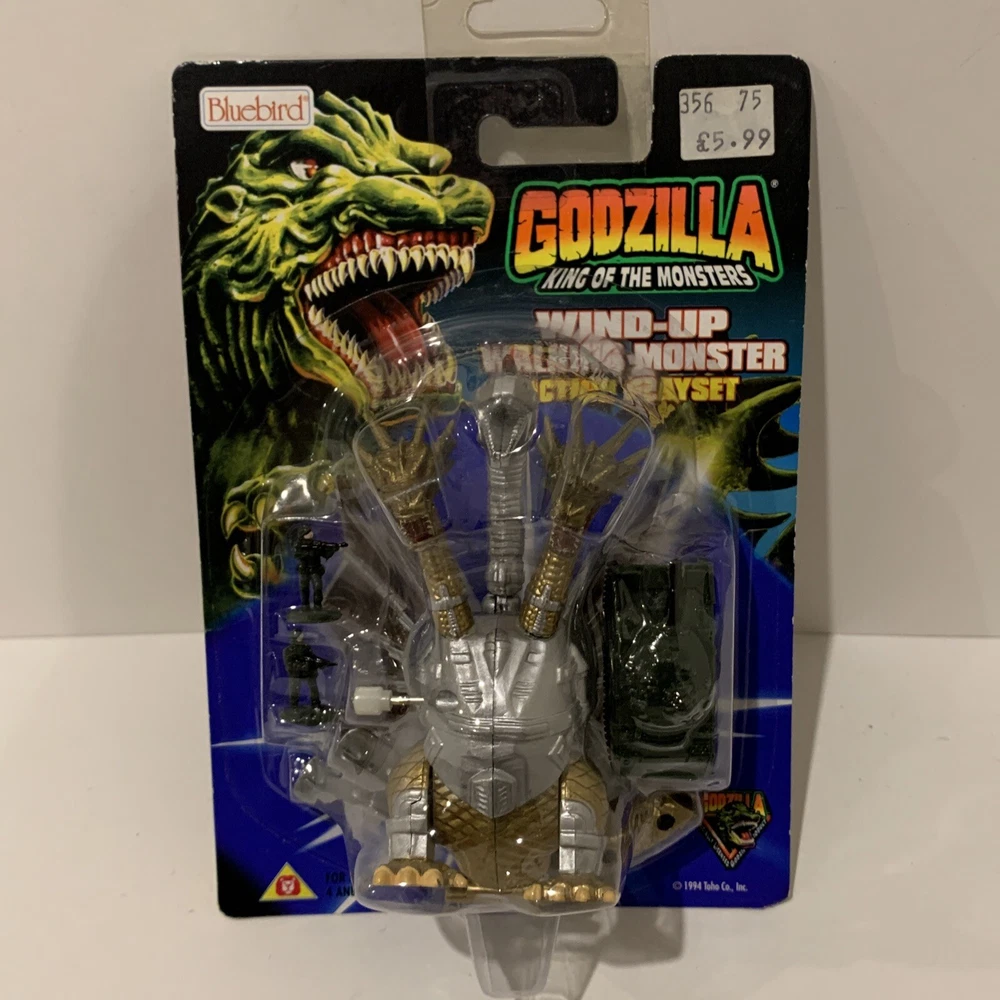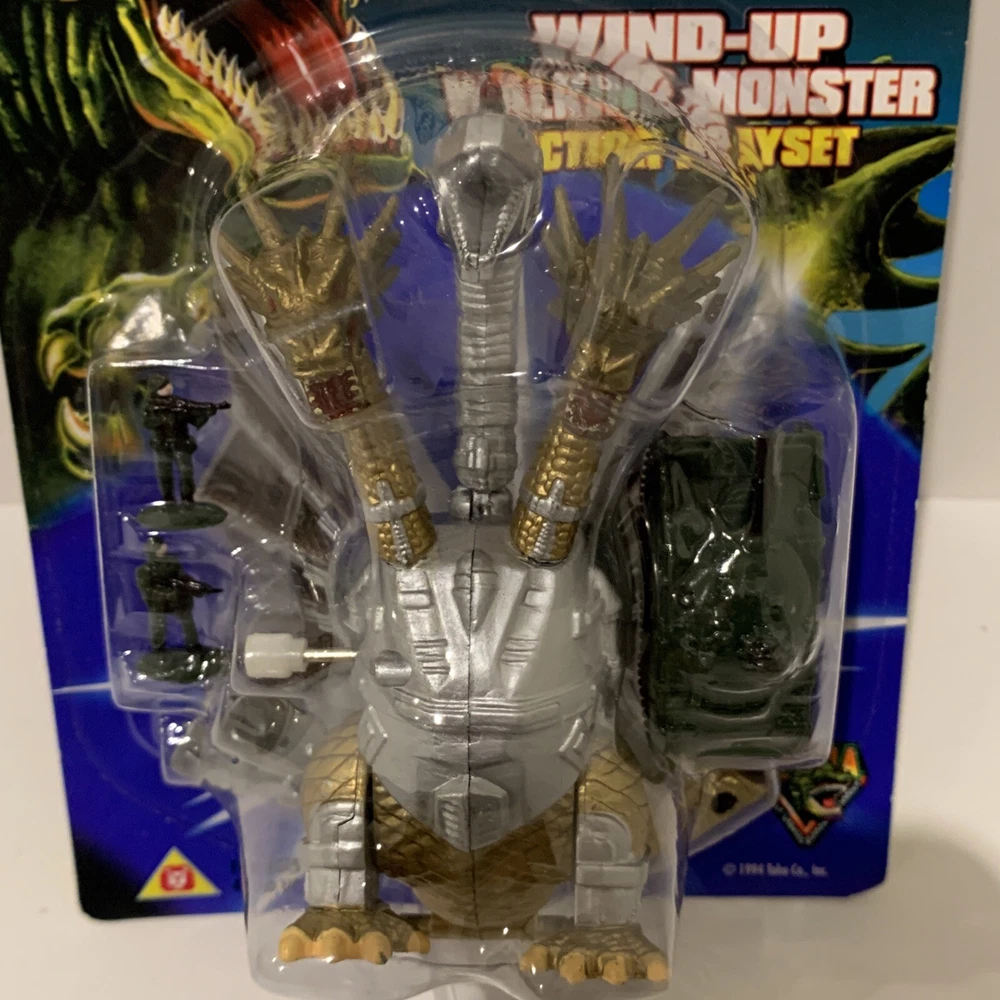 This vintage 1994 action figure from Trendmasters (Bluebird UK version) features the iconic characters Mecha-Ghidorah from the TV show and Movie Godzilla. The wind-up walker is a charming addition to any collection, with head and legs that move. The collectible trading card included is a must-have for any fan of the franchise. The packaging is original and unopened, ensuring that this item is in pristine condition for its new owner. This original, licensed reproduction is made of plastic and is appropriate for ages 4 and up. Perfect for collectors or fans of the franchise, this item is a great addition to any toy collection.