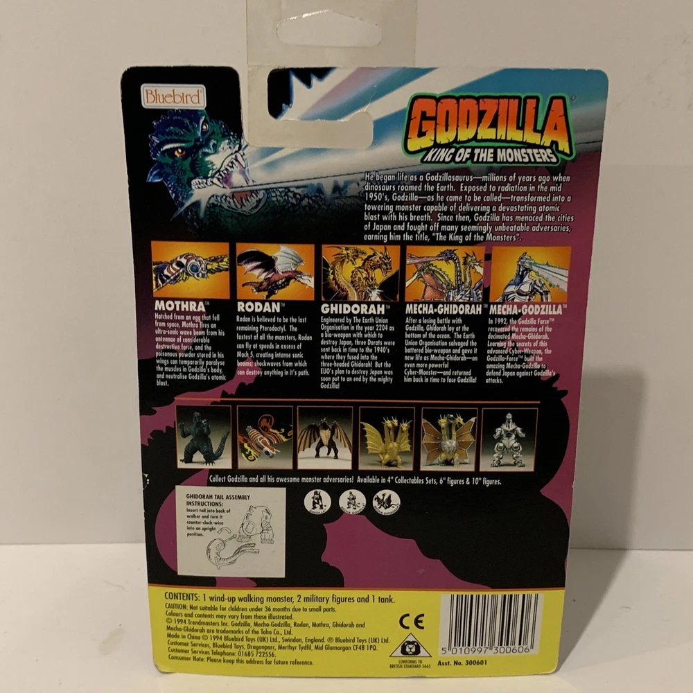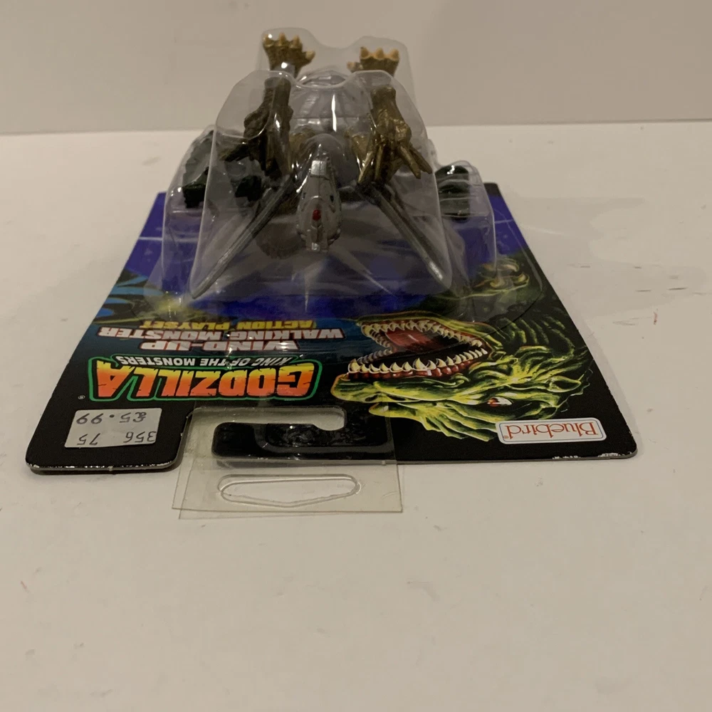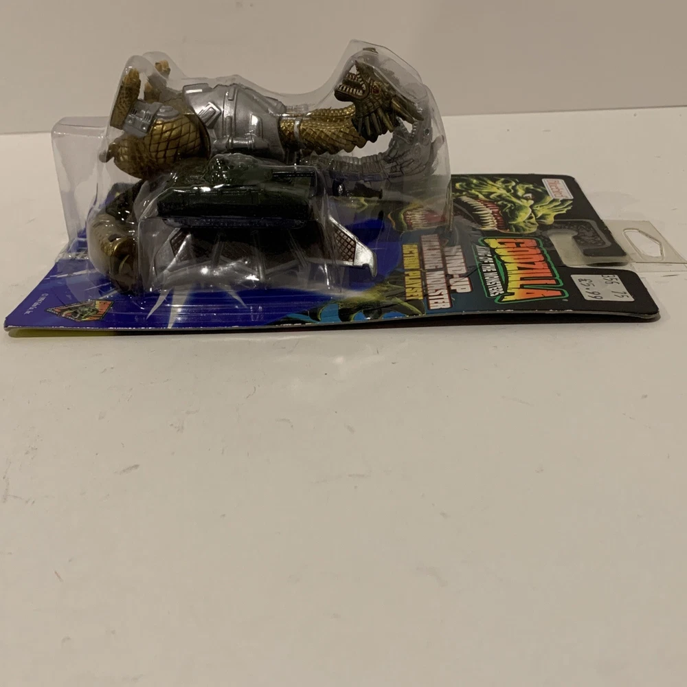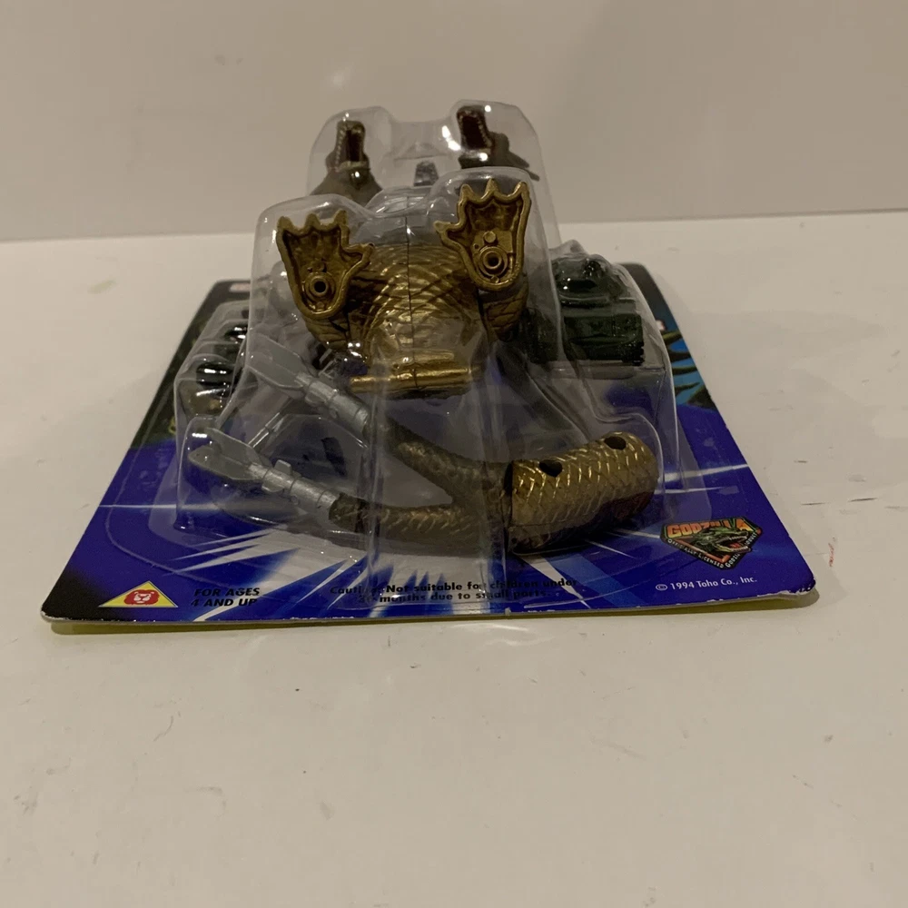 This vintage 1994 action figure from Trendmasters (Bluebird UK version) features the iconic characters Mecha-Ghidorah from the TV show and Movie Godzilla. The wind-up walker is a charming addition to any collection, with head and legs that move. The collectible trading card included is a must-have for any fan of the franchise. The packaging is original and unopened, ensuring that this item is in pristine condition for its new owner. This original, licensed reproduction is made of plastic and is appropriate for ages 4 and up. Perfect for collectors or fans of the franchise, this item is a great addition to any toy collection.