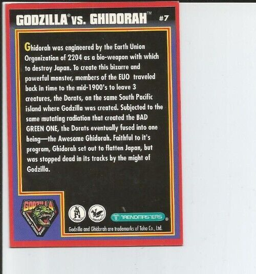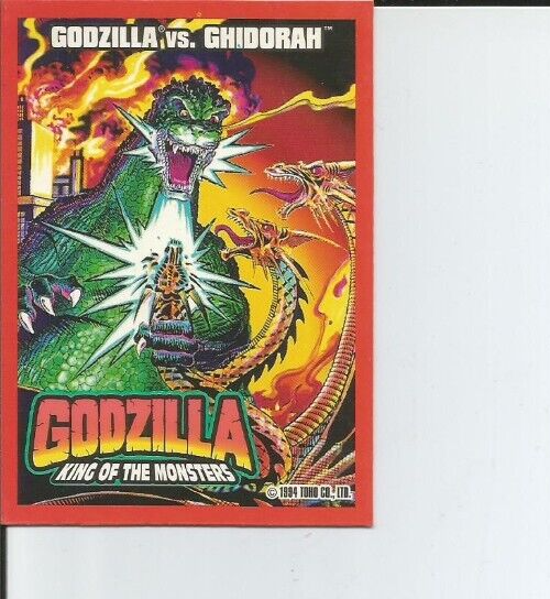 This auction is for a Rare Vintage Godzilla vs Ghidorah #7 trading card...Godzilla King of the Monsters...1994 TOHO Co. LTD...This cool card will definitely add to any Godzilla/Ghidorah collection...it was pre-owned but in excellent condition, very minimal wear around edges as seen in pictures and it does not have any rips, tears, stains or bends. WE TRY TO TAKE PICTURES TO REFLECT EVERYTHING WE DESCRIBE SO IF YOU NEED ADDITIONAL PICTURES JUST ASK...WE TRY TO GIVE ACCURATE DESCRIPTIONS OF OUR ITEMS AND ANY DEFECTS/DETAILS WE SEE SO PLEASE ASK ANY QUESTIONS BEFORE BIDDING-SOMETIMES WE MISS SOMETHING. ALSO SOME ITEMS WILL NEED ADDITIONAL CLEANING. WE ARE CONSTANTLY UPDATING AND ADDING MORE ITEMS SO BE SURE TO ADD US TO YOUR FAVORITES SO YOU DON'T MISS OUT ON ANY COOL DEALS OR RARE FINDS...THANK YOU FOR LOOKING AND HAPPY BIDDING!!!