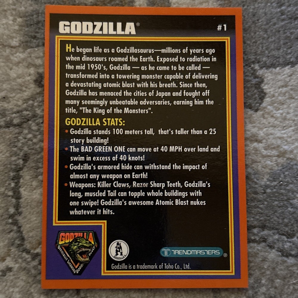 Step into the world of classic monster memorabilia with the 1994 Trendmasters Godzilla King Of the Monsters #1 Trading Card. A must-have for collectors and fans, this non-sport trading card captures the essence of the iconic creature that has thrilled audiences for generations. From the esteemed franchise of Godzilla, this card is a tribute to the king of monsters and is a standout piece from Trendmasters, known for their quality collectibles. Whether for display or as part of a comprehensive collection, this trading card is an excellent addition to any assortment of monster genre memorabilia.