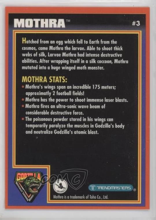 This Mothra card from the 1994 Trendmasters Godzilla set is a must-have for any kaiju collector! The vibrant colors and detailed artwork really make Mothra pop, and the card’s condition is fantastic. A nostalgic piece that brings back childhood memories while fitting perfectly into any Godzilla-themed collection. Highly recommended for fans of the King of the Monsters!
