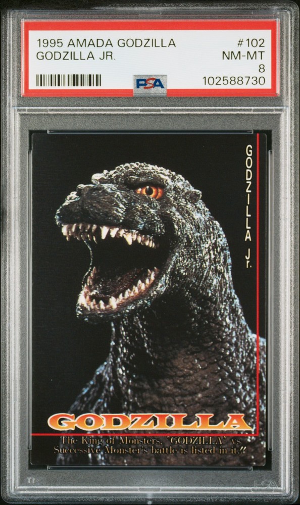 1995 AMADA GODZILLA #102 GODZILLA JR. PSA 8 1995 AMADA GODZILLA #102 GODZILLA JR. PSA 8 Purchase Info Thank you for your interest in this item consigned with PSA! By purchasing or making an offer on this item, you acknowledge and agree to the following terms: All sales are final. Returns not accepted. Payment must be made upon purchase of the item. All items are sold "as is" and without warranty of Collectors Universe, Inc. (d/b/a PSA), and ANY AND ALL IMPLIED WARRANTIES ARE DISCLAIMED AND EXCLUDED. Sales tax may apply depending on shipping address. PSA does not guarantee that another third-party grading company's authentication or certification of an item as genuine is correct or accurate. Neither a difference of opinion between third-party grading companies about authenticity, nor a company's subsequent reversal of its earlier authentication or certification of an item, will be a basis for rescinding a sale. Any dispute with another third-party grading company relating to the authenticity of an item must be resolved directly with that other company. Collectors' maximum liability in the event of loss or damage to an item during shipping will be the lesser of (a) the price paid for the item and (b) the change in fair market value of the item. You release Collectors from all other liability including for any claims of punitive damages, emotional distress, consequential damages, lost profits, or lost interest, except as prohibited by law. Shipping Purchased Items will be shipped directly from PSA Vault. You stay hands-free. PSA Vault When you purchase this item, you can save on sales tax and selling fees by keeping it in the PSA Vault, official Vault of eBay. Items already in PSA Vault and will be sent to PSA Vault will have no shipping charge Storage of any items with the PSA Vault will be subject to the PSA Vault Terms of Service. Consignment PSA has competitive rates on the world's largest collectibles marketplace with the option to list from the PSA Vault or immediately after PSA authentication and grading. Sale Price Under $100 $100 - $499 $500 - $999 $1,000 - $2,499 $2,500 - $4,999 $5,000+ Seller Fee 16% 14% 13% 10% 9% 7% Sellers pay a single fee as reflected above; no additional eBay fees are incurred. There is a $5 minimum fee on sold items.