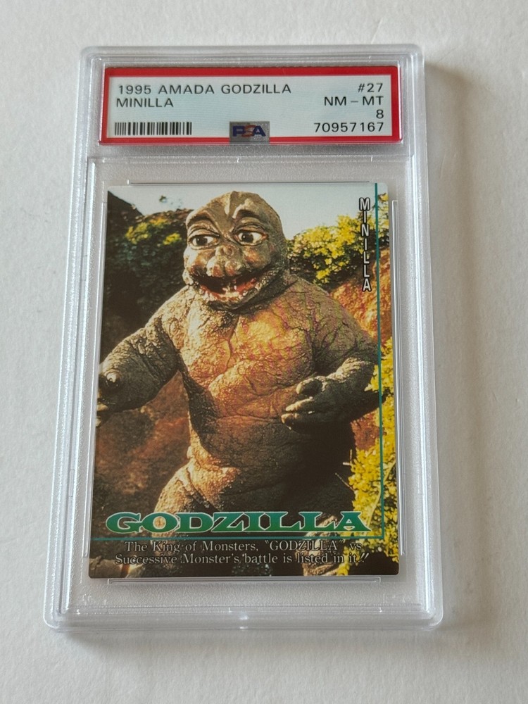THANK YOU for taking the time to view my eBay auction . To follow is a written description of this item that's detailed & accurate and including the items features & benefits, contents, condition as well as Shipping Fees and Payment Options. 1995 Amada GODZILLA The King of Monsters Card #27 Minilla (Baby Son of Godzilla) Japanese Made in Japan Professionally Authenticated & Graded PSA 8 NEAR MINT - MINT DESCRIPTION Shown in the photos are the front and back sides of the card. This offer is for one (1) card. THANK YOU FOR VISITING THIS AUCTION SHIPPING AND HANDLING: Our non-collectibles ship in very secure packaging to ensure your collectible is delivered to you in the best possible condition . Please review our stellar feedback regarding our customers comments on the QUALITY of our items and the QUALITY of our SHIPPING (Fast Delivery and Iron Clad Protective Packaging!). Please inquire regarding any S&H discounts for multiple items to be purchased, which is based on weight and dimensions. DOMESTIC (Anywhere in the USA) BIDDERS U.S.A. Optional U.S. Postal Insurance (for USA Destinations ONLY) Please ADD $2.00 for coverage of values up to $50 Insurance fee for values of $50.01 - $100 add $3.00 Insurance fee for values of $100.01 - $200 add $4.00 Insurance fee for values $200.01+ is an additional $4.00 plus $1.00 per $100 increment or fraction thereof. Sorry, I'm not responsible for Uninsured Deliveries (but you can check out my Feedback for comments on my reliable delivery & sturdy packaging. I've never encountered a problem with postal damage or non-delivery (lost mail). INTERNATIONAL BIDDERS: PLEASE INQUIRE FIRST BEFORE BIDDING IF YOU HAVE ANY QUESTIONS. International (NON-USA = Canada, Mexico, U.K., Asia, etc.) Buyers Bids (U.S. Funds Only) are Welcomed and Accepted & All Items Can Be Shipped Worldwide via AIRMAIL (Surface Mail is no longer available), but you must have adequate feedback otherwise I reserve the right to cancel your bid before the auction closes. Due to size dimensions and weight of the product and packaging, although I do offer international shipping and appreciate, respect and honor international bidders and customers, sometimes it is cost prohibitive on the shipping side for purchases, which I understand, and for that, if you are international and have a domestic (USA) delivery address through a friend or relative, I can ship to US addresses which I recommend if that is an option, but that address MUST BE registed to your account on Pay Pal, otherwise if you have a domestic (USA) friend or relative who has an eBay account, they could bid on this on your behalf to ship to the US. International CANADA International S&H Other Non-North America International (UK, Germany, France, Switzerland, Europe, Spain, South America, Australia, Japan, Asia, Etc.) NOTE TO INTERNATIONAL BIDDERS - Please know that the declared value of the sale price is the declared value which will be used when shipping the item. Unfortunately, it's against policy to circumvent any duties, taxes or fees related to the value by altering the value or status (i.e. this is not a gift, this is a sales transaction and is merchandise). I appologize that those facts are out of my control and it is your country, and not me who may charge whatever fees they deem necessary related to international sales transactions. OTHER IMPORTANT S&H DETAILS: All Items Protectively Packaged Sturdy and Secure, often times resulting in oversized and heavier parcels. Check out my feedback for testimonials on the quality of my packaging, quality of merchandise and speed of delivery. Sorry, S&H fees are not negotiable and are clearly described and listed above. Multiple Auction winners may (or may not) benefit a S&H discount (Depending on Weight, Size and Quantity), please inquire for details prior to bidding on multiple items. PLEASE INQUIRE BEFORE BIDDING FOR DETAILS. Odd shaped items may not be shipped together due to possible postal damages (i.e. a CD and an LP or a Poster can not or should not ship together with a Magazine, Comic or Sketchbook). With original comic art, being FLAT, only similar sized items should ship with them. METHODS OF PAYMENT: YES! You can make payment online through PAY PAL SHIPPING & DELIVERY DETAILS : All Items are Sent via U.S. Postal Service unless otherwise described. As many know, postal rates have increased and now factored into pricing is both weight and size dimensions, so oversized items are now more expensive to ship. I do prepare and handle my packages, using very sturdy oversized packaging materials to protect your item during transit so it is delivered sturdy and secure for you to enjoy quickly in collector’s investment quality condition. Expect Delivery of the Item in approx. 2-10 days (depending upon your location & method shipped) upon receipt of payment and clearance of funds. Airmail for International Bidders takes anywhere from 1-2 weeks. AGAIN, Please review my over 8,400 Positive “Green Star” eBay Feedback comments received regarding the quality merchandise, secure packaging, customer satisfaction and quick communication & speedy delivery. I never ever ask for or solicit customers for any eBay feedback, these are all comments that customers initiated and went out of their way and took the initiative to express their complete satisfaction and appreciation! In turn, I leave glowingly POSITIVE high praise feedback to buyers as well of course! FINAL DETAILS: PLEASE Include the mailing address (please PRINT clearly, because no matter how clear you think your penmanship is, it is in your best interest for accurate delivery to TYPE (respond via e'mail) your information) where you want your item sent along with this item number and/or name/title of the item (to expedite the process) along with payment to ensure speedy & accurate delivery. This package may be oversized, so include the address where you want this item delivered to. The easiest way is to print this Ebay auction listing o