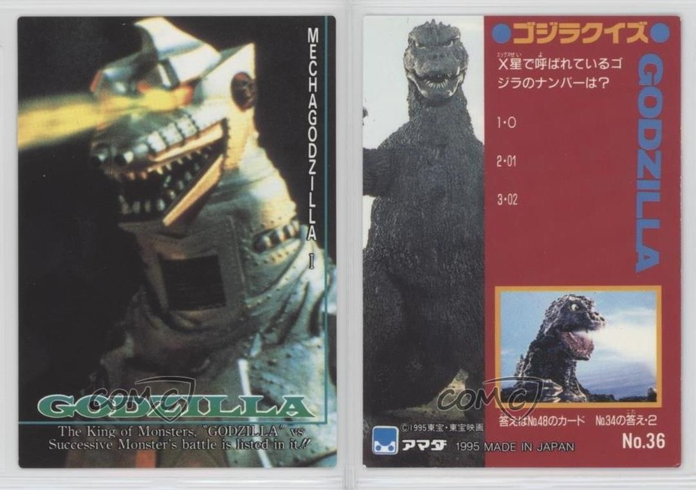 1995 Amada Godzilla Story - [Base] #36 Godzilla COMC Item: 41740503 - Non-Sports Card - Featuring Godzilla Search for more: 1995 Amada Godzilla Story Search for more: 1995 Amada Godzilla Story - [Base] View all of our Listings Auctions Buy It Now About Us Located in the beautiful Pacific Northwest, COMC (Check Out My Cards) is the world's largest consignment service for trading card singles. More than 10,000 people have used our consignment service to list over 50 million trading cards. Find out how we can help you consign your items on eBay by contacting us through eBay messaging. COMC -- "The Safe & Easy Way to Buy & Sell" Raw Condition for Modern Cards Unless otherwise noted, raw modern cards are listed in Near Mint-Mint condition or better. A NM-MT card appears to be Mint at first glance, but upon closer inspection, may exhibit some of the following: minor print defects (e.g. roller marks, print line, dimple), minor scratches, slight edge wear, and slight corner wear. Centering is clearly visible in the images provided and does not factor into our condition assessment. Raw Condition for Vintage Cards Unless otherwise noted, raw vintage cards are listed in Excellent condition or better. An EX card may exhibit some of the following: minor rounding of corners, surface wear, print defects, light scratches, and slight edge wear/chipping. Centering is clearly visible in the images provided and does not factor into our condition assessment. Domestic Shipping Combined shipping for multiple items is available. To receive combined shipping, please ensure all desired items are in your eBay shopping cart before proceeding to checkout. eBay limits orders to 40 items per order. We automatically combine multiple orders placed on the same day. If you place multiple orders on the same day, please contact us to request a refund of applicable shipping costs. Signature confirmation may be required on invoices over $400. All cards are protected and shipped securely. International Shipping COMC offers eBay's International Shipping (EIS) for international orders under $2,500* (see country exceptions below). All duties and import fees are paid at checkout; in the rare event that there are additional import fees upon delivery, these are borne by the buyer. EIS packages route through a shipping hub in Erlanger, KY before shipping to their final destination. Please note that EIS does not allow for combined shipments. The shipping rates are determined by eBay and cannot be adjusted. *Maximum sale price exceptions: Colombia, Kuwait ($2,000); Taiwan ($1,539); Chile, Costa Rica, Guatemala, Honduras, Trinidad and Tobago ($1,000); Antigua and Barbuda, Aruba, Belize, Dominica, Grenada, Philippines, Saint Kitts and Nevis, Saint Lucia, Montserrat, Turks and Caicos Islands ($500); Dominican Republic, El Salvador ($200). Please request a shipping quote through eBay messaging for orders that exceed the maximum sale price supported by eBay's International Shipping. You will be responsible for all duties and import fees for international orders shipped outside the EIS. All cards are protected and shipped securely. Payment COMC does not accept offers on our cards through our eBay storefront. COMC utilizes eBay’s managed payments system. If you are experiencing difficulties making a payment, please contact eBay for assistance. Return Policy Returns are only accepted on the rare occasion the item is not as described. If you are making a return, please initiate the return process through eBay so a mailing label can be provided for you. Prior to listing, our expert team carefully assessed this item to represent it accurately. Please review the description and high-definition images prior to purchasing to ensure this item meets your satisfaction. We welcome you to contact us if you have further questions about this item. Trust and Integrity COMC carefully assesses each item consigned to us to prevent fraudulent items from entering the marketplace. If you believe an item offered on COMC may be fraudulent, please contact us with details so we can investigate the issue. Items we determine are outside our supported items policy may be removed. Last Modified: 5/20/2025 4:17:24 PM PDT