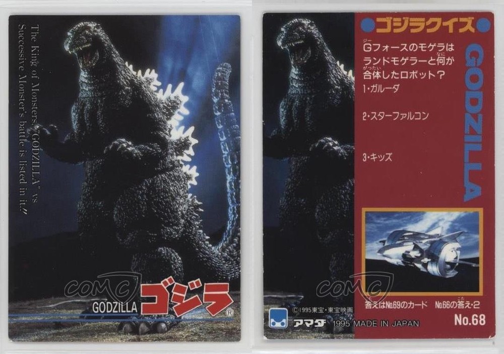 1995 Amada Godzilla Story - [Base] #68 Godzilla COMC Item: 220330522 - Non-Sports Card - Featuring Godzilla Search for more: 1995 Amada Godzilla Story Search for more: 1995 Amada Godzilla Story - [Base] View all of our Listings Auctions Buy It Now About Us Located in the beautiful Pacific Northwest, COMC (Check Out My Cards) is the world's largest consignment service for trading card singles. More than 10,000 people have used our consignment service to list over 50 million trading cards. Find out how we can help you consign your items on eBay by contacting us through eBay messaging. COMC -- "The Safe & Easy Way to Buy & Sell" Raw Condition for Modern Cards Unless otherwise noted, raw modern cards are listed in Near Mint-Mint condition or better. A NM-MT card appears to be Mint at first glance, but upon closer inspection, may exhibit some of the following: minor print defects (e.g. roller marks, print line, dimple), minor scratches, slight edge wear, and slight corner wear. Centering is clearly visible in the images provided and does not factor into our condition assessment. Raw Condition for Vintage Cards Unless otherwise noted, raw vintage cards are listed in Excellent condition or better. An EX card may exhibit some of the following: minor rounding of corners, surface wear, print defects, light scratches, and slight edge wear/chipping. Centering is clearly visible in the images provided and does not factor into our condition assessment. Domestic Shipping Combined shipping for multiple items is available. To receive combined shipping, please ensure all desired items are in your eBay shopping cart before proceeding to checkout. eBay limits orders to 40 items per order. We automatically combine multiple orders placed on the same day. If you place multiple orders on the same day, please contact us to request a refund of applicable shipping costs. Signature confirmation may be required on invoices over $400. All cards are protected and shipped securely. International Shipping COMC offers eBay's International Shipping (EIS) for international orders under $2,500* (see country exceptions below). All duties and import fees are paid at checkout; in the rare event that there are additional import fees upon delivery, these are borne by the buyer. EIS packages route through a shipping hub in Erlanger, KY before shipping to their final destination. Please note that EIS does not allow for combined shipments. The shipping rates are determined by eBay and cannot be adjusted. *Maximum sale price exceptions: Colombia, Kuwait ($2,000); Taiwan ($1,539); Chile, Costa Rica, Guatemala, Honduras, Trinidad and Tobago ($1,000); Antigua and Barbuda, Aruba, Belize, Dominica, Grenada, Philippines, Saint Kitts and Nevis, Saint Lucia, Montserrat, Turks and Caicos Islands ($500); Dominican Republic, El Salvador ($200). Please request a shipping quote through eBay messaging for orders that exceed the maximum sale price supported by eBay's International Shipping. You will be responsible for all duties and import fees for international orders shipped outside the EIS. All cards are protected and shipped securely. Payment COMC does not accept offers on our cards through our eBay storefront. COMC utilizes eBay’s managed payments system. If you are experiencing difficulties making a payment, please contact eBay for assistance. Return Policy Returns are only accepted on the rare occasion the item is not as described. If you are making a return, please initiate the return process through eBay so a mailing label can be provided for you. Prior to listing, our expert team carefully assessed this item to represent it accurately. Please review the description and high-definition images prior to purchasing to ensure this item meets your satisfaction. We welcome you to contact us if you have further questions about this item. Trust and Integrity COMC carefully assesses each item consigned to us to prevent fraudulent items from entering the marketplace. If you believe an item offered on COMC may be fraudulent, please contact us with details so we can investigate the issue. Items we determine are outside our supported items policy may be removed. Last Modified: 6/15/2025 5:41:39 AM PDT