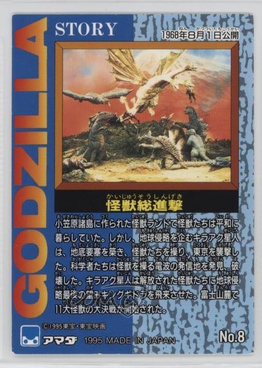 1995 Amada Godzilla Story - [Base] #8 Destroy all Monsters COMC Item: 220330545 - Non-Sports Card - Featuring Godzilla Search for more: 1995 Amada Godzilla Story Search for more: 1995 Amada Godzilla Story - [Base] View all of our Listings Auctions Buy It Now About Us Located in the beautiful Pacific Northwest, COMC (Check Out My Cards) is the world's largest consignment service for trading card singles. More than 10,000 people have used our consignment service to list over 50 million trading cards. Find out how we can help you consign your items on eBay by contacting us through eBay messaging. COMC -- "The Safe & Easy Way to Buy & Sell" Raw Condition for Modern Cards Unless otherwise noted, raw modern cards are listed in Near Mint-Mint condition or better. A NM-MT card appears to be Mint at first glance, but upon closer inspection, may exhibit some of the following: minor print defects (e.g. roller marks, print line, dimple), minor scratches, slight edge wear, and slight corner wear. Centering is clearly visible in the images provided and does not factor into our condition assessment. Raw Condition for Vintage Cards Unless otherwise noted, raw vintage cards are listed in Excellent condition or better. An EX card may exhibit some of the following: minor rounding of corners, surface wear, print defects, light scratches, and slight edge wear/chipping. Centering is clearly visible in the images provided and does not factor into our condition assessment. Domestic Shipping Combined shipping for multiple items is available. To receive combined shipping, please ensure all desired items are in your eBay shopping cart before proceeding to checkout. eBay limits orders to 40 items per order. We automatically combine multiple orders placed on the same day. If you place multiple orders on the same day, please contact us to request a refund of applicable shipping costs. Signature confirmation may be required on invoices over $400. All cards are protected and shipped securely. International Shipping COMC offers eBay's International Shipping (EIS) for international orders under $2,500* (see country exceptions below). All duties and import fees are paid at checkout; in the rare event that there are additional import fees upon delivery, these are borne by the buyer. EIS packages route through a shipping hub in Erlanger, KY before shipping to their final destination. Please note that EIS does not allow for combined shipments. The shipping rates are determined by eBay and cannot be adjusted. *Maximum sale price exceptions: Colombia, Kuwait ($2,000); Taiwan ($1,539); Chile, Costa Rica, Guatemala, Honduras, Trinidad and Tobago ($1,000); Antigua and Barbuda, Aruba, Belize, Dominica, Grenada, Philippines, Saint Kitts and Nevis, Saint Lucia, Montserrat, Turks and Caicos Islands ($500); Dominican Republic, El Salvador ($200). Please request a shipping quote through eBay messaging for orders that exceed the maximum sale price supported by eBay's International Shipping. You will be responsible for all duties and import fees for international orders shipped outside the EIS. All cards are protected and shipped securely. Payment COMC does not accept offers on our cards through our eBay storefront. COMC utilizes eBay’s managed payments system. If you are experiencing difficulties making a payment, please contact eBay for assistance. Return Policy Returns are only accepted on the rare occasion the item is not as described. If you are making a return, please initiate the return process through eBay so a mailing label can be provided for you. Prior to listing, our expert team carefully assessed this item to represent it accurately. Please review the description and high-definition images prior to purchasing to ensure this item meets your satisfaction. We welcome you to contact us if you have further questions about this item. Trust and Integrity COMC carefully assesses each item consigned to us to prevent fraudulent items from entering the marketplace. If you believe an item offered on COMC may be fraudulent, please contact us with details so we can investigate the issue. Items we determine are outside our supported items policy may be removed. Last Modified: 6/19/2025 4:39:10 AM PDT