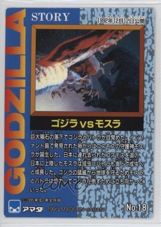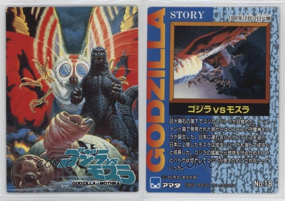 1995 Amada Godzilla Story - [Base] #18 Godzilla vs. Mothra COMC Item: 220330568 - Non-Sports Card - Featuring Godzilla and Mohra Search for more: 1995 Amada Godzilla Story Search for more: 1995 Amada Godzilla Story - [Base] View all of our Listings Auctions Buy It Now About Us Located in the beautiful Pacific Northwest, COMC (Check Out My Cards) is the world's largest consignment service for trading card singles. More than 10,000 people have used our consignment service to list over 50 million trading cards. Find out how we can help you consign your items on eBay by contacting us through eBay messaging. COMC -- "The Safe & Easy Way to Buy & Sell" Raw Condition for Modern Cards Unless otherwise noted, raw modern cards are listed in Near Mint-Mint condition or better. A NM-MT card appears to be Mint at first glance, but upon closer inspection, may exhibit some of the following: minor print defects (e.g. roller marks, print line, dimple), minor scratches, slight edge wear, and slight corner wear. Centering is clearly visible in the images provided and does not factor into our condition assessment. Raw Condition for Vintage Cards Unless otherwise noted, raw vintage cards are listed in Excellent condition or better. An EX card may exhibit some of the following: minor rounding of corners, surface wear, print defects, light scratches, and slight edge wear/chipping. Centering is clearly visible in the images provided and does not factor into our condition assessment. Domestic Shipping Combined shipping for multiple items is available. To receive combined shipping, please ensure all desired items are in your eBay shopping cart before proceeding to checkout. eBay limits orders to 40 items per order. We automatically combine multiple orders placed on the same day. If you place multiple orders on the same day, please contact us to request a refund of applicable shipping costs. Signature confirmation may be required on invoices over $400. All cards are protected and shipped securely. International Shipping COMC offers eBay's International Shipping (EIS) for international orders under $2,500* (see country exceptions below). All duties and import fees are paid at checkout; in the rare event that there are additional import fees upon delivery, these are borne by the buyer. EIS packages route through a shipping hub in Erlanger, KY before shipping to their final destination. Please note that EIS does not allow for combined shipments. The shipping rates are determined by eBay and cannot be adjusted. *Maximum sale price exceptions: Colombia, Kuwait ($2,000); Taiwan ($1,539); Chile, Costa Rica, Guatemala, Honduras, Trinidad and Tobago ($1,000); Antigua and Barbuda, Aruba, Belize, Dominica, Grenada, Philippines, Saint Kitts and Nevis, Saint Lucia, Montserrat, Turks and Caicos Islands ($500); Dominican Republic, El Salvador ($200). Please request a shipping quote through eBay messaging for orders that exceed the maximum sale price supported by eBay's International Shipping. You will be responsible for all duties and import fees for international orders shipped outside the EIS. All cards are protected and shipped securely. Payment COMC does not accept offers on our cards through our eBay storefront. COMC utilizes eBay’s managed payments system. If you are experiencing difficulties making a payment, please contact eBay for assistance. Return Policy Returns are only accepted on the rare occasion the item is not as described. If you are making a return, please initiate the return process through eBay so a mailing label can be provided for you. Prior to listing, our expert team carefully assessed this item to represent it accurately. Please review the description and high-definition images prior to purchasing to ensure this item meets your satisfaction. We welcome you to contact us if you have further questions about this item. Trust and Integrity COMC carefully assesses each item consigned to us to prevent fraudulent items from entering the marketplace. If you believe an item offered on COMC may be fraudulent, please contact us with details so we can investigate the issue. Items we determine are outside our supported items policy may be removed. Last Modified: 6/10/2025 11:58:14 AM PDT