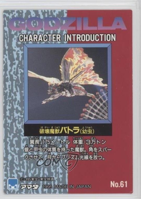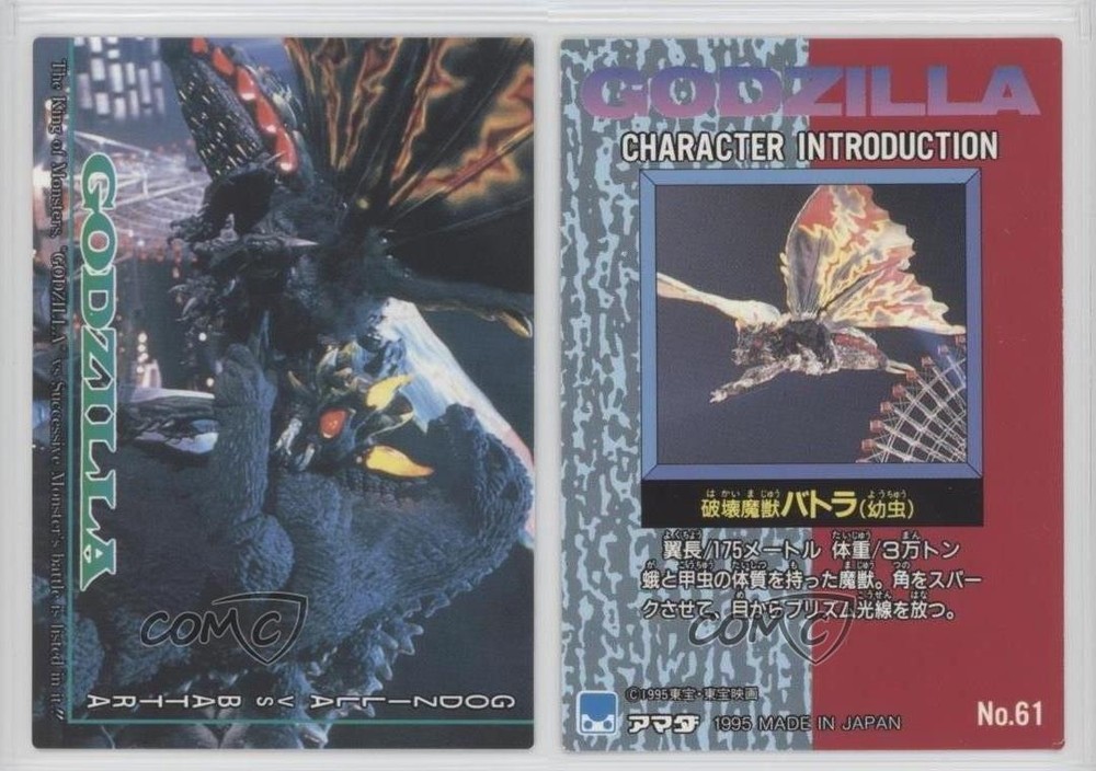 1995 Amada Godzilla Story - [Base] #61 Godzilla vs. Battra COMC Item: 41746170 - Non-Sports Card - Featuring Godzilla and Battra Search for more: 1995 Amada Godzilla Story Search for more: 1995 Amada Godzilla Story - [Base] View all of our Listings Auctions Buy It Now About Us Located in the beautiful Pacific Northwest, COMC (Check Out My Cards) is the world's largest consignment service for trading card singles. More than 10,000 people have used our consignment service to list over 50 million trading cards. Find out how we can help you consign your items on eBay by contacting us through eBay messaging. COMC -- "The Safe & Easy Way to Buy & Sell" Raw Condition for Modern Cards Unless otherwise noted, raw modern cards are listed in Near Mint-Mint condition or better. A NM-MT card appears to be Mint at first glance, but upon closer inspection, may exhibit some of the following: minor print defects (e.g. roller marks, print line, dimple), minor scratches, slight edge wear, and slight corner wear. Centering is clearly visible in the images provided and does not factor into our condition assessment. Raw Condition for Vintage Cards Unless otherwise noted, raw vintage cards are listed in Excellent condition or better. An EX card may exhibit some of the following: minor rounding of corners, surface wear, print defects, light scratches, and slight edge wear/chipping. Centering is clearly visible in the images provided and does not factor into our condition assessment. Domestic Shipping Combined shipping for multiple items is available. To receive combined shipping, please ensure all desired items are in your eBay shopping cart before proceeding to checkout. eBay limits orders to 40 items per order. We automatically combine multiple orders placed on the same day. If you place multiple orders on the same day, please contact us to request a refund of applicable shipping costs. Signature confirmation may be required on invoices over $400. All cards are protected and shipped securely. International Shipping COMC offers eBay's International Shipping (EIS) for international orders under $2,500* (see country exceptions below). All duties and import fees are paid at checkout; in the rare event that there are additional import fees upon delivery, these are borne by the buyer. EIS packages route through a shipping hub in Erlanger, KY before shipping to their final destination. Please note that EIS does not allow for combined shipments. The shipping rates are determined by eBay and cannot be adjusted. *Maximum sale price exceptions: Colombia, Kuwait ($2,000); Taiwan ($1,539); Chile, Costa Rica, Guatemala, Honduras, Trinidad and Tobago ($1,000); Antigua and Barbuda, Aruba, Belize, Dominica, Grenada, Philippines, Saint Kitts and Nevis, Saint Lucia, Montserrat, Turks and Caicos Islands ($500); Dominican Republic, El Salvador ($200). Please request a shipping quote through eBay messaging for orders that exceed the maximum sale price supported by eBay's International Shipping. You will be responsible for all duties and import fees for international orders shipped outside the EIS. All cards are protected and shipped securely. Payment COMC does not accept offers on our cards through our eBay storefront. COMC utilizes eBay’s managed payments system. If you are experiencing difficulties making a payment, please contact eBay for assistance. Return Policy Returns are only accepted on the rare occasion the item is not as described. If you are making a return, please initiate the return process through eBay so a mailing label can be provided for you. Prior to listing, our expert team carefully assessed this item to represent it accurately. Please review the description and high-definition images prior to purchasing to ensure this item meets your satisfaction. We welcome you to contact us if you have further questions about this item. Trust and Integrity COMC carefully assesses each item consigned to us to prevent fraudulent items from entering the marketplace. If you believe an item offered on COMC may be fraudulent, please contact us with details so we can investigate the issue. Items we determine are outside our supported items policy may be removed. Last Modified: 5/24/2025 7:13:29 PM PDT