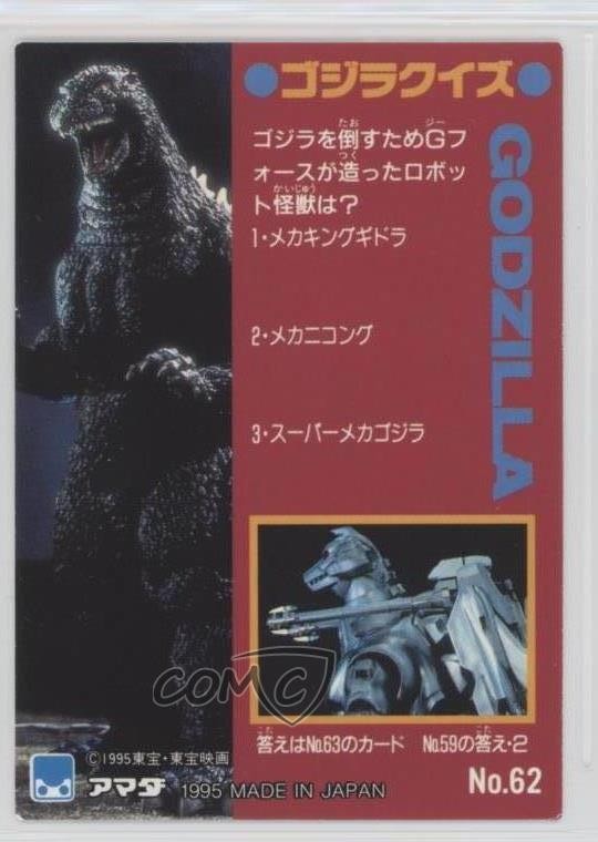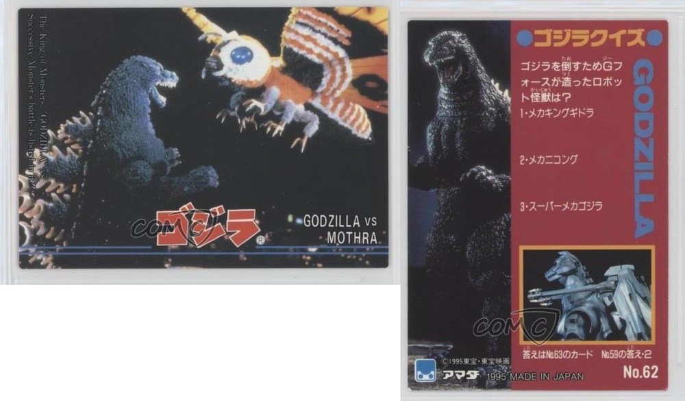 1995 Amada Godzilla Story - [Base] #62 Godzilla vs Mothra COMC Item: 41742717 - Non-Sports Card - Featuring Godzilla and Mothra Search for more: 1995 Amada Godzilla Story Search for more: 1995 Amada Godzilla Story - [Base] View all of our Listings Auctions Buy It Now About Us Located in the beautiful Pacific Northwest, COMC (Check Out My Cards) is the world's largest consignment service for trading card singles. More than 10,000 people have used our consignment service to list over 50 million trading cards. Find out how we can help you consign your items on eBay by contacting us through eBay messaging. COMC -- "The Safe & Easy Way to Buy & Sell" Raw Condition for Modern Cards Unless otherwise noted, raw modern cards are listed in Near Mint-Mint condition or better. A NM-MT card appears to be Mint at first glance, but upon closer inspection, may exhibit some of the following: minor print defects (e.g. roller marks, print line, dimple), minor scratches, slight edge wear, and slight corner wear. Centering is clearly visible in the images provided and does not factor into our condition assessment. Raw Condition for Vintage Cards Unless otherwise noted, raw vintage cards are listed in Excellent condition or better. An EX card may exhibit some of the following: minor rounding of corners, surface wear, print defects, light scratches, and slight edge wear/chipping. Centering is clearly visible in the images provided and does not factor into our condition assessment. Domestic Shipping Combined shipping for multiple items is available. To receive combined shipping, please ensure all desired items are in your eBay shopping cart before proceeding to checkout. eBay limits orders to 40 items per order. We automatically combine multiple orders placed on the same day. If you place multiple orders on the same day, please contact us to request a refund of applicable shipping costs. Signature confirmation may be required on invoices over $400. All cards are protected and shipped securely. International Shipping COMC offers eBay's International Shipping (EIS) for international orders under $2,500* (see country exceptions below). All duties and import fees are paid at checkout; in the rare event that there are additional import fees upon delivery, these are borne by the buyer. EIS packages route through a shipping hub in Erlanger, KY before shipping to their final destination. Please note that EIS does not allow for combined shipments. The shipping rates are determined by eBay and cannot be adjusted. *Maximum sale price exceptions: Colombia, Kuwait ($2,000); Taiwan ($1,539); Chile, Costa Rica, Guatemala, Honduras, Trinidad and Tobago ($1,000); Antigua and Barbuda, Aruba, Belize, Dominica, Grenada, Philippines, Saint Kitts and Nevis, Saint Lucia, Montserrat, Turks and Caicos Islands ($500); Dominican Republic, El Salvador ($200). Please request a shipping quote through eBay messaging for orders that exceed the maximum sale price supported by eBay's International Shipping. You will be responsible for all duties and import fees for international orders shipped outside the EIS. All cards are protected and shipped securely. Payment COMC does not accept offers on our cards through our eBay storefront. COMC utilizes eBay’s managed payments system. If you are experiencing difficulties making a payment, please contact eBay for assistance. Return Policy Returns are only accepted on the rare occasion the item is not as described. If you are making a return, please initiate the return process through eBay so a mailing label can be provided for you. Prior to listing, our expert team carefully assessed this item to represent it accurately. Please review the description and high-definition images prior to purchasing to ensure this item meets your satisfaction. We welcome you to contact us if you have further questions about this item. Trust and Integrity COMC carefully assesses each item consigned to us to prevent fraudulent items from entering the marketplace. If you believe an item offered on COMC may be fraudulent, please contact us with details so we can investigate the issue. Items we determine are outside our supported items policy may be removed. Last Modified: 5/24/2025 5:20:58 PM PDT