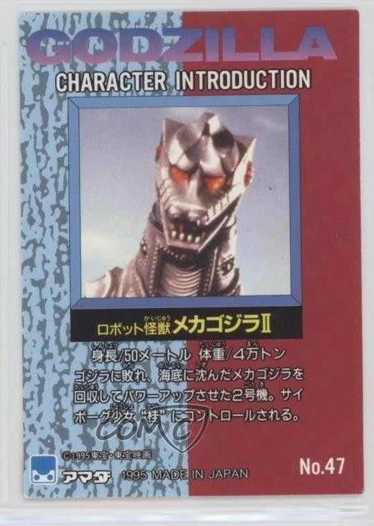 This Mechagodzilla card is an awesome find for any Godzilla collector! The 1995 Amada design looks sharp, and the colors pop. Perfect condition, great for displaying or completing your set. Super happy with this purchase—definitely a must-have for fans of the classic kaiju battles. Fast shipping and well-packed too!