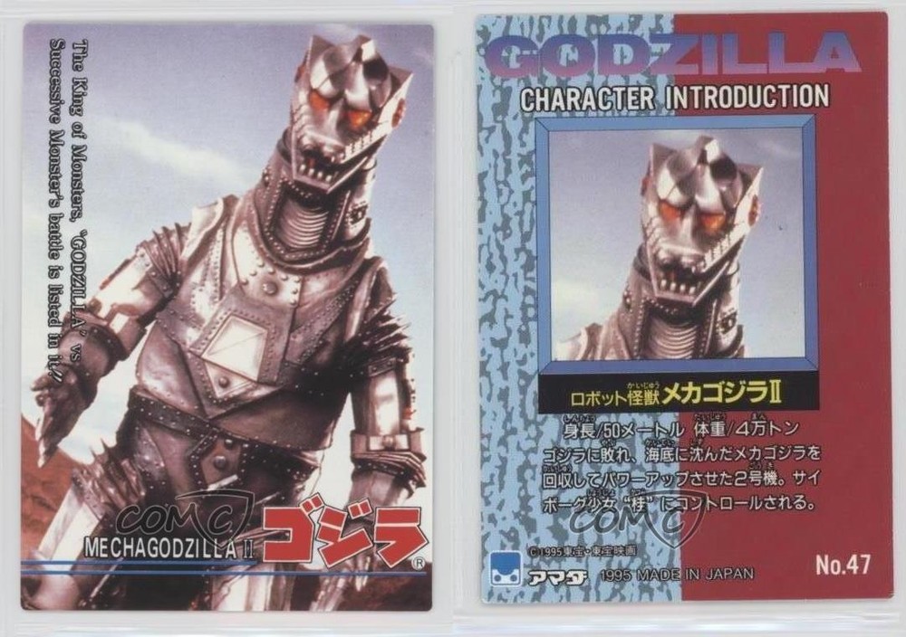1995 Amada Godzilla Story - [Base] #47 Mechagodzilla COMC Item: 41742232 - Non-Sports Card - Featuring Mechagodzilla Search for more: 1995 Amada Godzilla Story Search for more: 1995 Amada Godzilla Story - [Base] View all of our Listings Auctions Buy It Now About Us Located in the beautiful Pacific Northwest, COMC (Check Out My Cards) is the world's largest consignment service for trading card singles. More than 10,000 people have used our consignment service to list over 50 million trading cards. Find out how we can help you consign your items on eBay by contacting us through eBay messaging. COMC -- "The Safe & Easy Way to Buy & Sell" Raw Condition for Modern Cards Unless otherwise noted, raw modern cards are listed in Near Mint-Mint condition or better. A NM-MT card appears to be Mint at first glance, but upon closer inspection, may exhibit some of the following: minor print defects (e.g. roller marks, print line, dimple), minor scratches, slight edge wear, and slight corner wear. Centering is clearly visible in the images provided and does not factor into our condition assessment. Raw Condition for Vintage Cards Unless otherwise noted, raw vintage cards are listed in Excellent condition or better. An EX card may exhibit some of the following: minor rounding of corners, surface wear, print defects, light scratches, and slight edge wear/chipping. Centering is clearly visible in the images provided and does not factor into our condition assessment. Domestic Shipping Combined shipping for multiple items is available. To receive combined shipping, please ensure all desired items are in your eBay shopping cart before proceeding to checkout. eBay limits orders to 40 items per order. We automatically combine multiple orders placed on the same day. If you place multiple orders on the same day, please contact us to request a refund of applicable shipping costs. Signature confirmation may be required on invoices over $400. All cards are protected and shipped securely. International Shipping COMC offers eBay's International Shipping (EIS) for international orders under $2,500* (see country exceptions below). All duties and import fees are paid at checkout; in the rare event that there are additional import fees upon delivery, these are borne by the buyer. EIS packages route through a shipping hub in Erlanger, KY before shipping to their final destination. Please note that EIS does not allow for combined shipments. The shipping rates are determined by eBay and cannot be adjusted. *Maximum sale price exceptions: Colombia, Kuwait ($2,000); Taiwan ($1,539); Chile, Costa Rica, Guatemala, Honduras, Trinidad and Tobago ($1,000); Antigua and Barbuda, Aruba, Belize, Dominica, Grenada, Philippines, Saint Kitts and Nevis, Saint Lucia, Montserrat, Turks and Caicos Islands ($500); Dominican Republic, El Salvador ($200). Please request a shipping quote through eBay messaging for orders that exceed the maximum sale price supported by eBay's International Shipping. You will be responsible for all duties and import fees for international orders shipped outside the EIS. All cards are protected and shipped securely. Payment COMC does not accept offers on our cards through our eBay storefront. COMC utilizes eBay’s managed payments system. If you are experiencing difficulties making a payment, please contact eBay for assistance. Return Policy Returns are only accepted on the rare occasion the item is not as described. If you are making a return, please initiate the return process through eBay so a mailing label can be provided for you. Prior to listing, our expert team carefully assessed this item to represent it accurately. Please review the description and high-definition images prior to purchasing to ensure this item meets your satisfaction. We welcome you to contact us if you have further questions about this item. Trust and Integrity COMC carefully assesses each item consigned to us to prevent fraudulent items from entering the marketplace. If you believe an item offered on COMC may be fraudulent, please contact us with details so we can investigate the issue. Items we determine are outside our supported items policy may be removed. Last Modified: 5/24/2025 11:26:46 AM PDT
