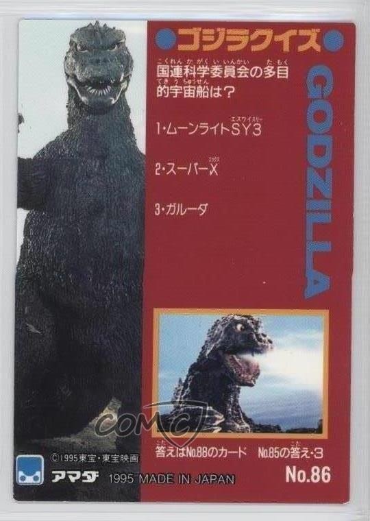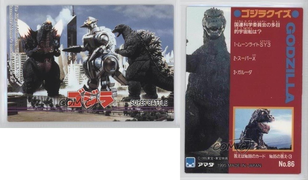 1995 Amada Godzilla Story - [Base] #86 Super Battle COMC Item: 29830870 - Non-Sports Card Search for more: 1995 Amada Godzilla Story Search for more: 1995 Amada Godzilla Story - [Base] View all of our Listings Auctions Buy It Now About Us Located in the beautiful Pacific Northwest, COMC (Check Out My Cards) is the world's largest consignment service for trading card singles. More than 10,000 people have used our consignment service to list over 50 million trading cards. Find out how we can help you consign your items on eBay by contacting us through eBay messaging. COMC -- "The Safe & Easy Way to Buy & Sell" Raw Condition for Modern Cards Unless otherwise noted, raw modern cards are listed in Near Mint-Mint condition or better. A NM-MT card appears to be Mint at first glance, but upon closer inspection, may exhibit some of the following: minor print defects (e.g. roller marks, print line, dimple), minor scratches, slight edge wear, and slight corner wear. Centering is clearly visible in the images provided and does not factor into our condition assessment. Raw Condition for Vintage Cards Unless otherwise noted, raw vintage cards are listed in Excellent condition or better. An EX card may exhibit some of the following: minor rounding of corners, surface wear, print defects, light scratches, and slight edge wear/chipping. Centering is clearly visible in the images provided and does not factor into our condition assessment. Domestic Shipping Combined shipping for multiple items is available. To receive combined shipping, please ensure all desired items are in your eBay shopping cart before proceeding to checkout. eBay limits orders to 40 items per order. We automatically combine multiple orders placed on the same day. If you place multiple orders on the same day, please contact us to request a refund of applicable shipping costs. Signature confirmation may be required on invoices over $400. All cards are protected and shipped securely. International Shipping COMC offers eBay's International Shipping (EIS) for international orders under $2,500* (see country exceptions below). All duties and import fees are paid at checkout; in the rare event that there are additional import fees upon delivery, these are borne by the buyer. EIS packages route through a shipping hub in Erlanger, KY before shipping to their final destination. Please note that EIS does not allow for combined shipments. The shipping rates are determined by eBay and cannot be adjusted. *Maximum sale price exceptions: Colombia, Kuwait ($2,000); Taiwan ($1,539); Chile, Costa Rica, Guatemala, Honduras, Trinidad and Tobago ($1,000); Antigua and Barbuda, Aruba, Belize, Dominica, Grenada, Philippines, Saint Kitts and Nevis, Saint Lucia, Montserrat, Turks and Caicos Islands ($500); Dominican Republic, El Salvador ($200). Please request a shipping quote through eBay messaging for orders that exceed the maximum sale price supported by eBay's International Shipping. You will be responsible for all duties and import fees for international orders shipped outside the EIS. All cards are protected and shipped securely. Payment COMC does not accept offers on our cards through our eBay storefront. COMC utilizes eBay’s managed payments system. If you are experiencing difficulties making a payment, please contact eBay for assistance. Return Policy Returns are only accepted on the rare occasion the item is not as described. If you are making a return, please initiate the return process through eBay so a mailing label can be provided for you. Prior to listing, our expert team carefully assessed this item to represent it accurately. Please review the description and high-definition images prior to purchasing to ensure this item meets your satisfaction. We welcome you to contact us if you have further questions about this item. Trust and Integrity COMC carefully assesses each item consigned to us to prevent fraudulent items from entering the marketplace. If you believe an item offered on COMC may be fraudulent, please contact us with details so we can investigate the issue. Items we determine are outside our supported items policy may be removed. Last Modified: 6/10/2025 11:58:41 AM PDT