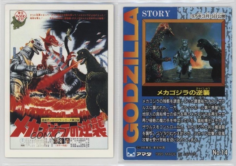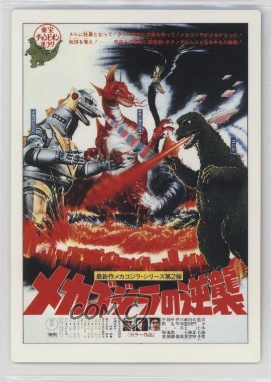 1995 Amada Godzilla Story - [Base] #14 Terror of Mechagodzilla COMC Item: 215435580 - Non-Sports Card - Featuring Mechagodzilla Search for more: 1995 Amada Godzilla Story Search for more: 1995 Amada Godzilla Story - [Base] View all of our Listings Auctions Buy It Now About Us Located in the beautiful Pacific Northwest, COMC (Check Out My Cards) is the world's largest consignment service for trading card singles. More than 10,000 people have used our consignment service to list over 50 million trading cards. Find out how we can help you consign your items on eBay by contacting us through eBay messaging. COMC -- "The Safe & Easy Way to Buy & Sell" Raw Condition for Modern Cards Unless otherwise noted, raw modern cards are listed in Near Mint-Mint condition or better. A NM-MT card appears to be Mint at first glance, but upon closer inspection, may exhibit some of the following: minor print defects (e.g. roller marks, print line, dimple), minor scratches, slight edge wear, and slight corner wear. Centering is clearly visible in the images provided and does not factor into our condition assessment. Raw Condition for Vintage Cards Unless otherwise noted, raw vintage cards are listed in Excellent condition or better. An EX card may exhibit some of the following: minor rounding of corners, surface wear, print defects, light scratches, and slight edge wear/chipping. Centering is clearly visible in the images provided and does not factor into our condition assessment. Domestic Shipping Combined shipping for multiple items is available. To receive combined shipping, please ensure all desired items are in your eBay shopping cart before proceeding to checkout. eBay limits orders to 40 items per order. We automatically combine multiple orders placed on the same day. If you place multiple orders on the same day, please contact us to request a refund of applicable shipping costs. Signature confirmation may be required on invoices over $400. All cards are protected and shipped securely. International Shipping COMC offers eBay's International Shipping (EIS) for international orders under $2,500* (see country exceptions below). All duties and import fees are paid at checkout; in the rare event that there are additional import fees upon delivery, these are borne by the buyer. EIS packages route through a shipping hub in Erlanger, KY before shipping to their final destination. Please note that EIS does not allow for combined shipments. The shipping rates are determined by eBay and cannot be adjusted. *Maximum sale price exceptions: Colombia, Kuwait ($2,000); Taiwan ($1,539); Chile, Costa Rica, Guatemala, Honduras, Trinidad and Tobago ($1,000); Antigua and Barbuda, Aruba, Belize, Dominica, Grenada, Philippines, Saint Kitts and Nevis, Saint Lucia, Montserrat, Turks and Caicos Islands ($500); Dominican Republic, El Salvador ($200). Please request a shipping quote through eBay messaging for orders that exceed the maximum sale price supported by eBay's International Shipping. You will be responsible for all duties and import fees for international orders shipped outside the EIS. All cards are protected and shipped securely. Payment COMC does not accept offers on our cards through our eBay storefront. COMC utilizes eBay’s managed payments system. If you are experiencing difficulties making a payment, please contact eBay for assistance. Return Policy Returns are only accepted on the rare occasion the item is not as described. If you are making a return, please initiate the return process through eBay so a mailing label can be provided for you. Prior to listing, our expert team carefully assessed this item to represent it accurately. Please review the description and high-definition images prior to purchasing to ensure this item meets your satisfaction. We welcome you to contact us if you have further questions about this item. Trust and Integrity COMC carefully assesses each item consigned to us to prevent fraudulent items from entering the marketplace. If you believe an item offered on COMC may be fraudulent, please contact us with details so we can investigate the issue. Items we determine are outside our supported items policy may be removed. Last Modified: 6/19/2025 4:50:57 AM PDT