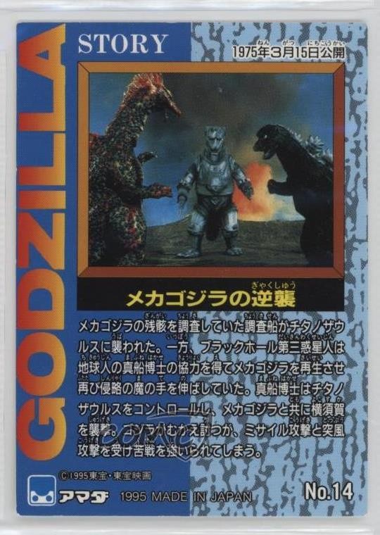This vintage 1995 Amada Godzilla card is a must-have for kaiju collectors! The dynamic Terror of Mechagodzilla artwork pops with vibrant colors, capturing the epic battle in stunning detail. The card condition is excellent, making it perfect for display or adding to your Godzilla collection. A fantastic piece of 90s nostalgia that any fan would love to own!