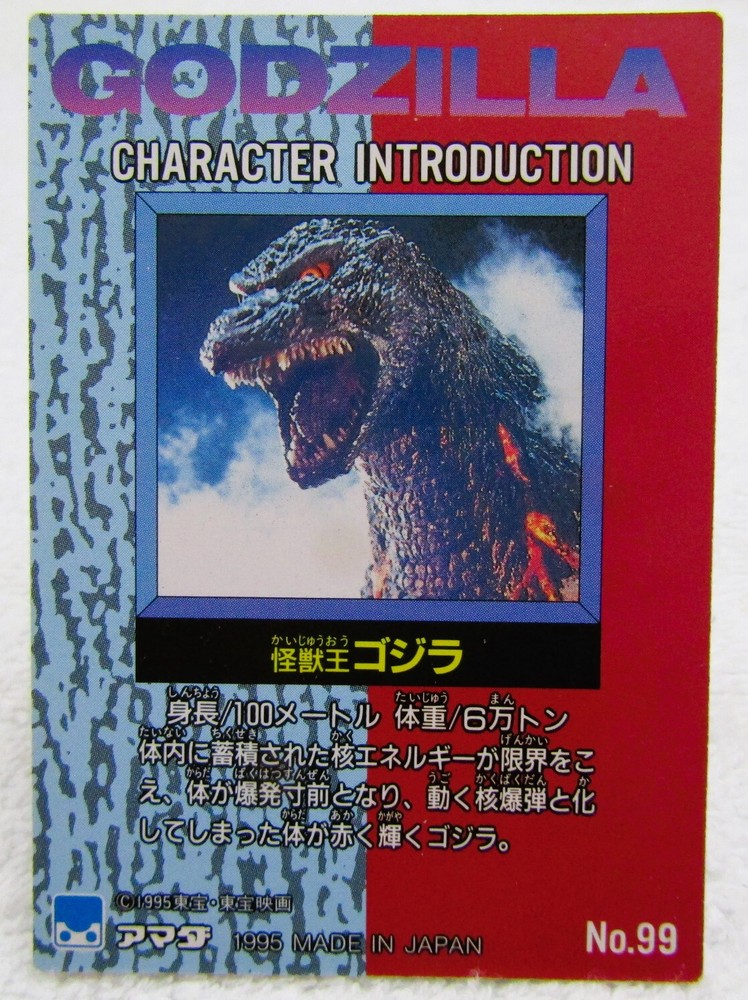 1995 Amada Toho Burning Godzilla Prism Trading Card #99 I list all my cards as 'Heavily played (Poor)' even if they might be in mint condition. Please check the pics carefully for defects. If I notice anything out of the ordinary I will add extra pics. All Cards are placed in a new penny sleeve, followed by a top loader and then sealed in a team bag before shipping. ________________________ PAYMENT ________________________ * Payment must be received within 7 days or I will re-list the item/s and cancel the transaction to recover my lost fees. * If you're buying more than one item then please pay for everything in one combined invoice. ________________________ SHIPPING ________________________ * I ship Worldwide! * Shipping within the USA is FREE! International shipping is fairly calculated based on your location. ________________________ OTHER ________________________ * Picture is of the actual Item being sold. Unless there are multiple quantities available, in which case you can expect them all to be in similar condition compared to the pic shown.