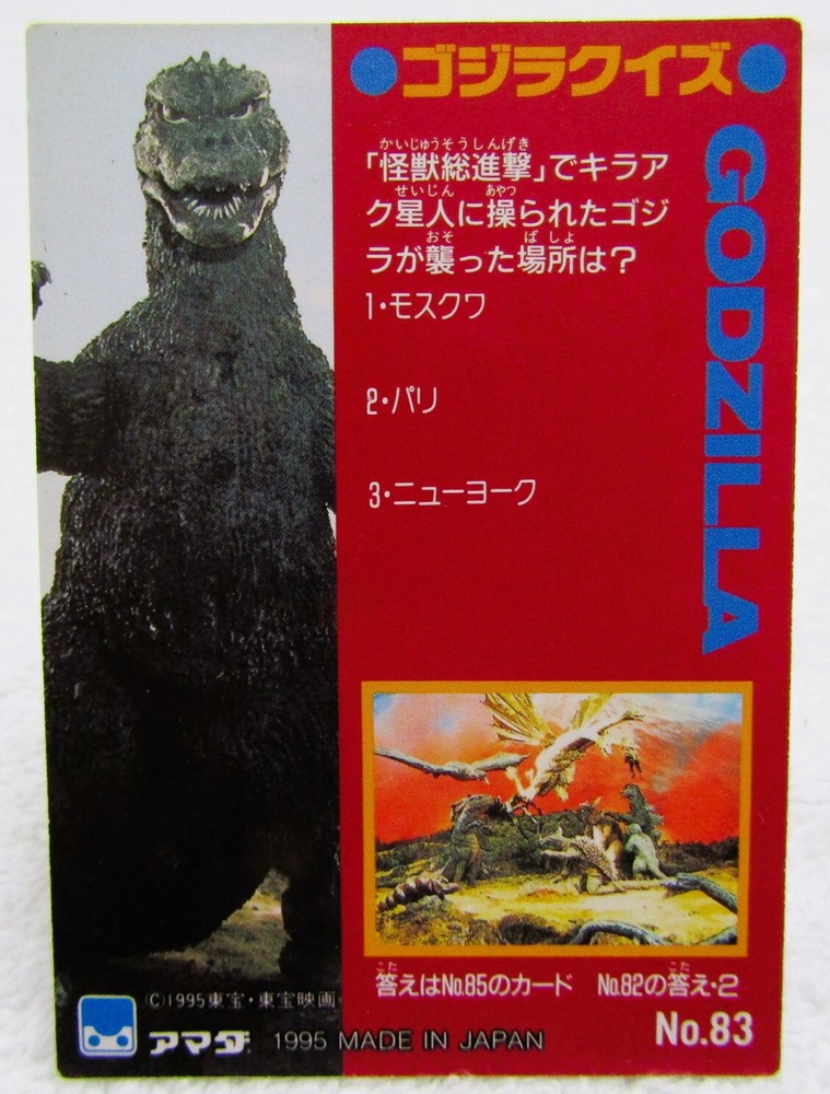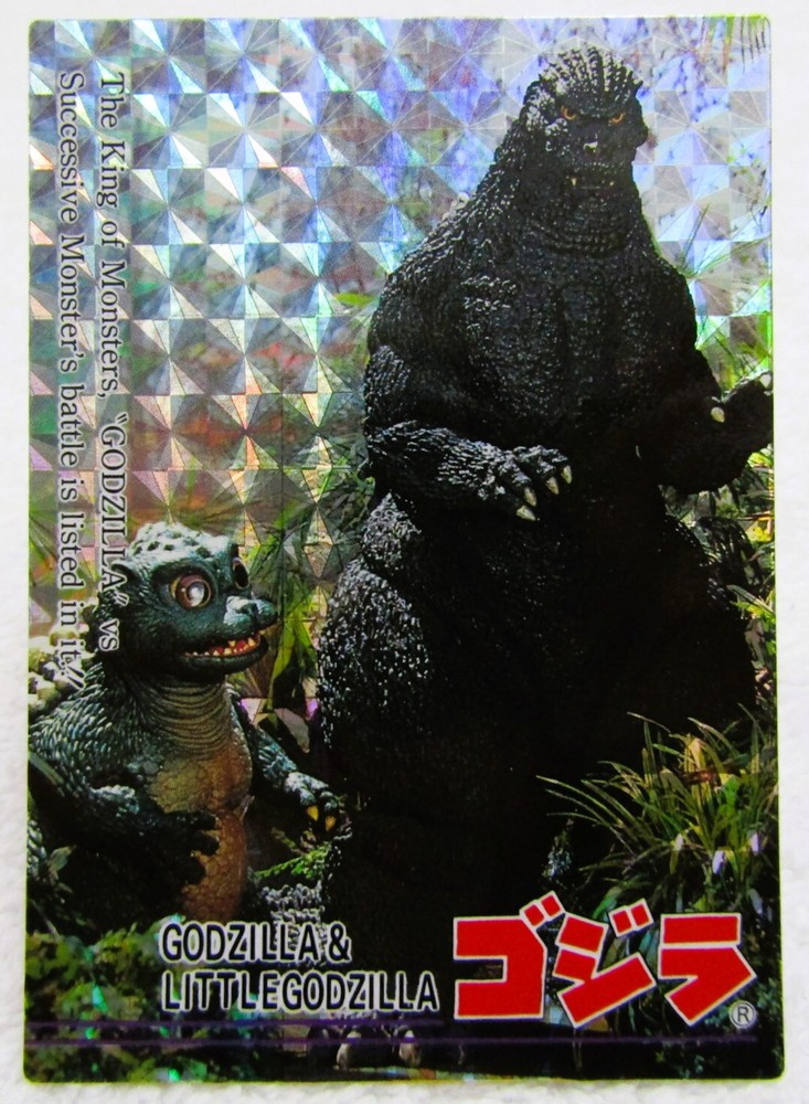 1995 Amada Toho Godzilla & Little Godzilla Prism Trading Card #83 I list all my cards as 'Heavily played (Poor)' even if they might be in mint condition. Please check the pics carefully for defects. If I notice anything out of the ordinary I will add extra pics. All Cards are placed in a new penny sleeve, followed by a new semi rigid holder and then placed in between 2 thin layers of cardboard before shipping. ________________________ PAYMENT ________________________ * Payment must be received within 7 days or I will re-list the item/s and cancel the transaction to recover my lost fees. * If you're buying more than one item then please pay for everything in one combined invoice. ________________________ SHIPPING ________________________ * I ship Worldwide! * Shipping within the USA is FREE! International shipping is fairly calculated based on your location. ________________________ OTHER ________________________ * Picture is of the actual Item being sold. Unless there are multiple quantities available, in which case you can expect them all to be in similar condition compared to the pic shown.