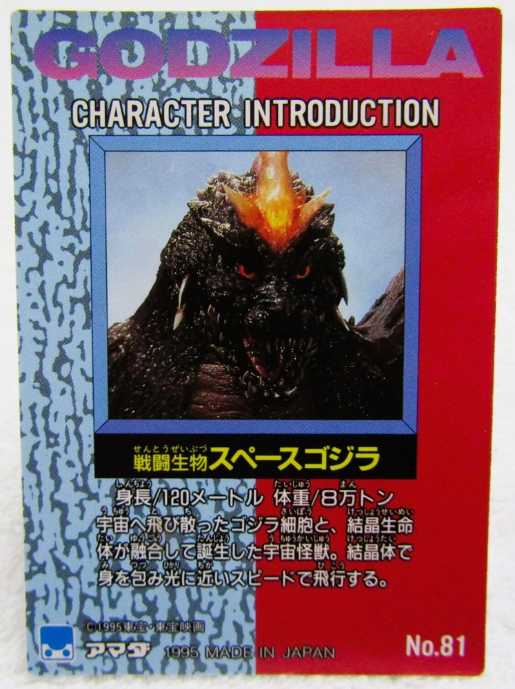 1995 Amada Toho Space Godzilla Prism Trading Card #81 I list all my cards as 'Heavily played (Poor)' even if they might be in mint condition. Please check the pics carefully for defects. If I notice anything out of the ordinary I will add extra pics. All Cards are placed in a new penny sleeve, followed by a top loader and then sealed in a team bag before shipping. ________________________ PAYMENT ________________________ * Payment must be received within 7 days or I will re-list the item/s and cancel the transaction to recover my lost fees. * If you're buying more than one item then please pay for everything in one combined invoice. ________________________ SHIPPING ________________________ * I ship Worldwide! * Shipping within the USA is FREE! International shipping is fairly calculated based on your location. ________________________ OTHER ________________________ * Picture is of the actual Item being sold. Unless there are multiple quantities available, in which case you can expect them all to be in similar condition compared to the pic shown.