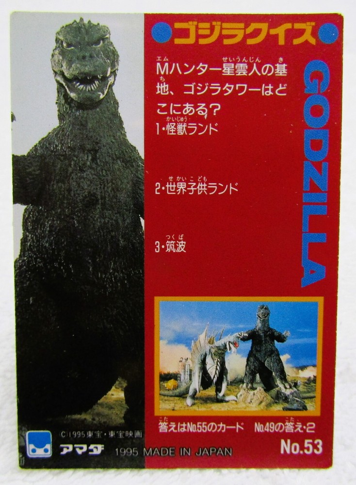 1995 Amada Toho Super Battle Godzilla Mothra Battra Prism Trading Card #53 I list all my cards as 'Heavily played (Poor)' even if they might be in mint condition. Please check the pics carefully for defects. If I notice anything out of the ordinary I will add extra pics. All Cards are placed in a new penny sleeve, followed by a new semi rigid holder and then placed in between 2 thin layers of cardboard before shipping. ________________________ PAYMENT ________________________ * Payment must be received within 7 days or I will re-list the item/s and cancel the transaction to recover my lost fees. * If you're buying more than one item then please pay for everything in one combined invoice. ________________________ SHIPPING ________________________ * I ship Worldwide! * Shipping within the USA is FREE! International shipping is fairly calculated based on your location. ________________________ OTHER ________________________ * Picture is of the actual Item being sold. Unless there are multiple quantities available, in which case you can expect them all to be in similar condition compared to the pic shown.