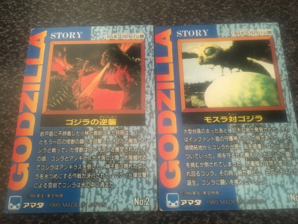 THIS SALE IS FOR THE 1995 GODZILLA BASE CARD LOT. THERE ARE 102 CARDS TO COMPLETE THE SET. IT IS IN JAPANESE. THE CARDS YOU DON'T SEE ARE PRIZM/REFRACTOR CARDS SOLD IN ANOTHER AUCTION. THESE CARDS WERE PULLED FROM THE PACKS. THERE ARE DUPLICATES TO THE CARDS (5). EACH CARD IS $.90. LIST; 2(2), 3(2), 4(2), 5(3), 6(6), 7(3), 8(2), 9(3), 10, 11(6), 12(3), 13(2), 14(3), 15, 16(6), 17(3), 18(2), 19(2), 20, 22(6), 24(4), 25(2), 27(3), 28, 29(5), 30(3) 31(2), 32(3), 33, 34(5), 36(2), 37(2), 38(4), 39, 40(5), 41(3), 42(3), 43(3), 44, 45(4), 46(3), 47(2), 49(3), 50, 51(4), 52(3), 54(3), 55(2), 56(5), 57(2), 58(4), 59(3), 60(2), 61(5), 62(4), 63(3), 64(3), 65(2), 66(5), 67(3), 68(3), 69(3), 71(2), 72(5), 73(4), 74(4), 75(3), 76(2), 77(2), 78(4), 79(3), 80(3), 82, 84(2), 85(3), 86(4), 87(2), 88(3), 89(2), 90(5), 91(3), 92(3), 93(2), 94, 95(4), 96(3), 98(3), 100(3), 102 THIS ITEM WILL BE SHIPPED IN A BUBBLE WRAPPED ENVELOPE, FIRST CLASS. I COMBINE AUCTIONS. PLEASE OUT MY OTHER GODZILLA AUCTIONS.