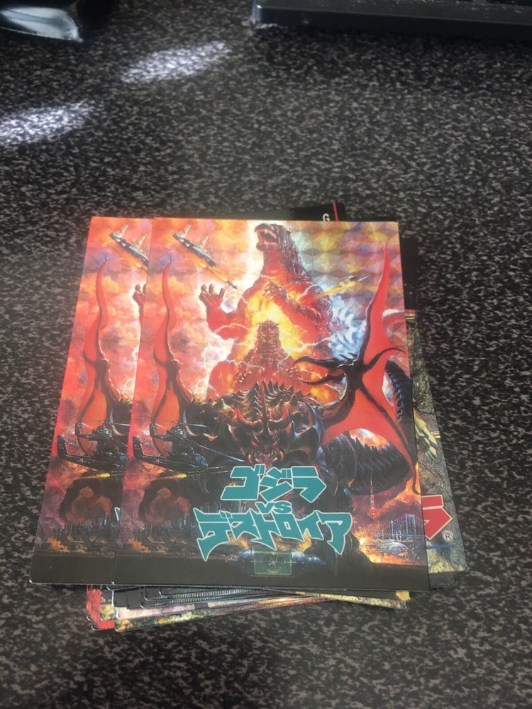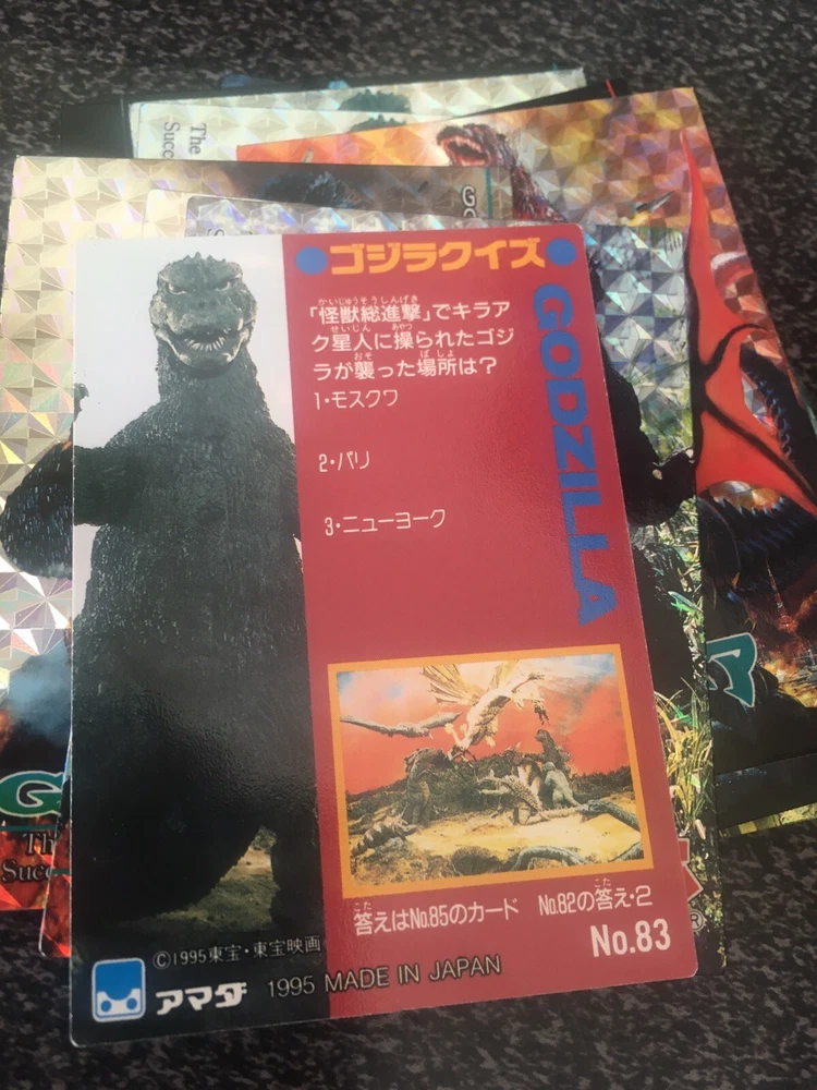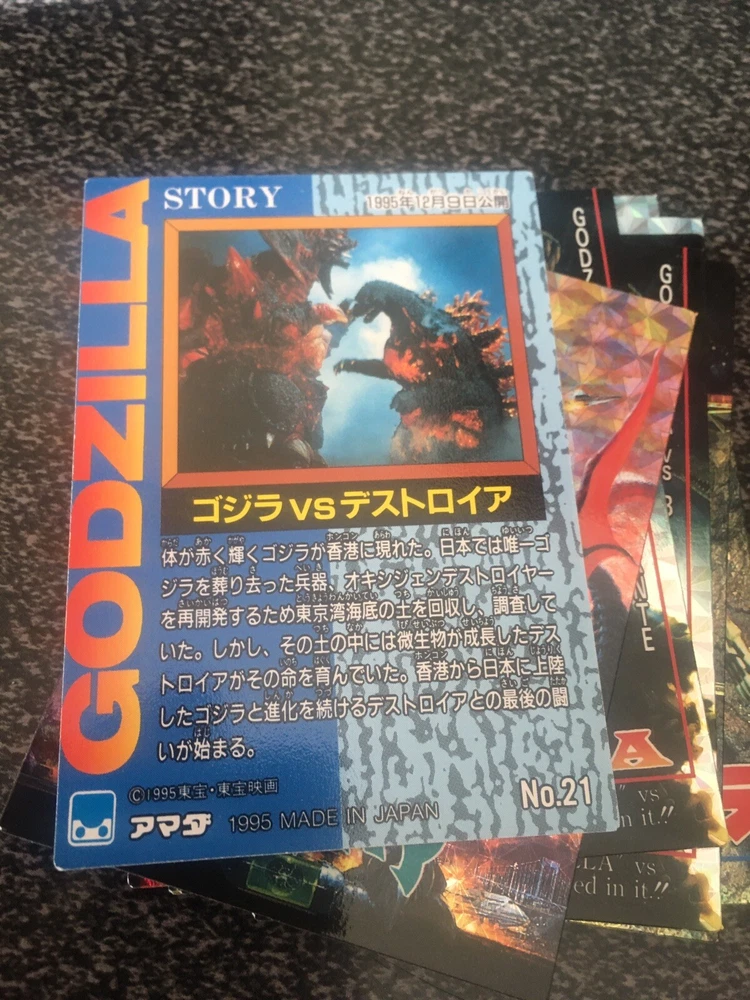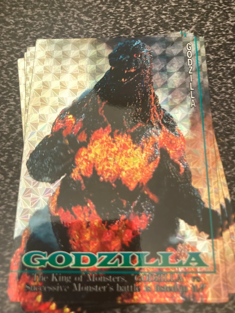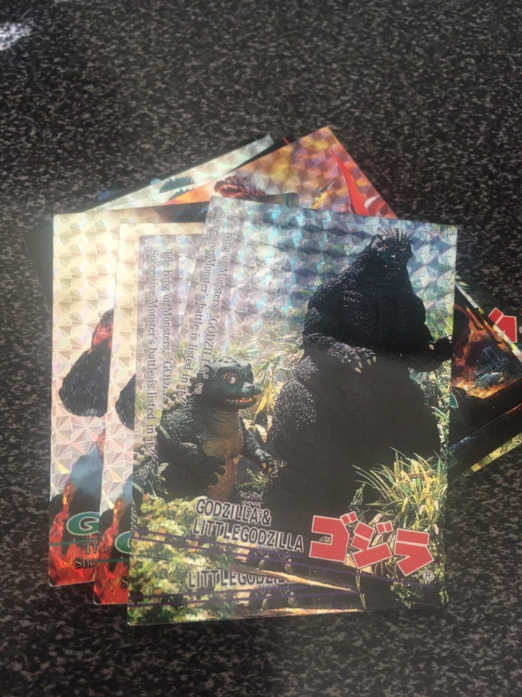 THIS SALE IS FOR THE 1995 GODZILLA PRISM-REFRACTOR CARDS. THESE CARDS ARE PART OF THE SET. IT IS IN JAPANESE. THESE CARDS WERE PULLED FROM THE PACKS. THERE ARE DUPLICATES (3). EACH CARD IS $10.00. PLEASE SEND ME YOUR CARD NUMBER(S) UPON PURCHASE. SHIPPING IS ONLY $4.50. 21-GODZILLA (3) 23-GODZILLA vs BIOLLANTE (6) 26-MECHAGODZILLA (5) 35-GODZILLA (3) 70-MECHAGODZILLA (4) 81-SPACEGODZILLA (5) 99-GODZILLA (3) THIS ITEM WILL BE SHIPPED IN A BUBBLE WRAPPED ENVELOPE, FIRST CLASS. I DO COMBINE SHIPPING WITH OTHER AUCTIONS. PLEASE OUT MY OTHER GODZILLA AUCTIONS.