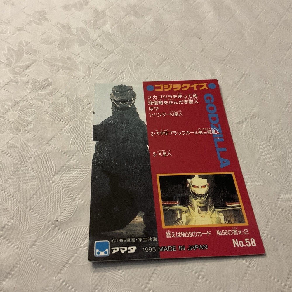 This 1995 Godzilla Collection Checklist Japan Trading Card #58 is perfect for any fan of non-sport trading cards and the Godzilla franchise. The card is in great condition and features a checklist, making it a must-have addition to any collection. Manufactured in Japan in 1995, this card is a rare find that will be sure to impress any collector. It belongs to the category of collectibles and non-sport trading cards, specifically trading card singles. So, don't miss out on the opportunity to add this unique piece to your collection.