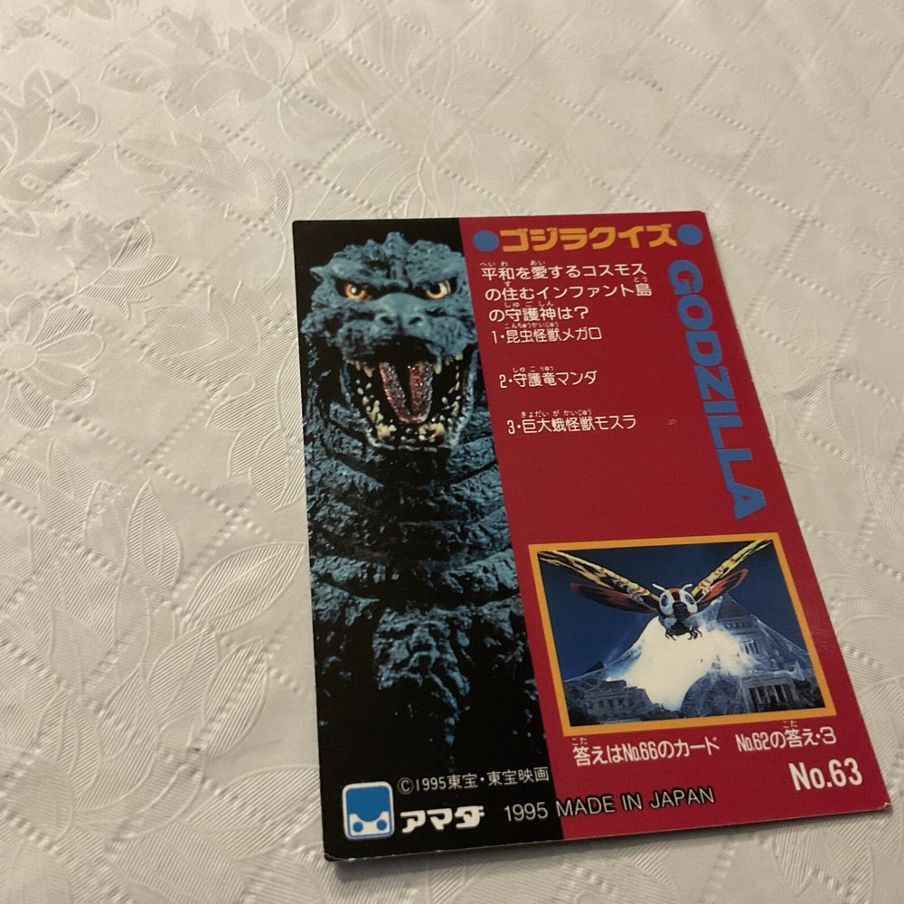 This 1995 Godzilla Collection Checklist Japan Trading Card #63 is a must-have for any fan of the franchise. Featuring a unique checklist design, this non-sport trading card is in very good condition, making it a great addition to any collection. Manufactured in Japan, this card is a true rarity and a testament to the enduring popularity of the Godzilla franchise. With its striking design and clear attention to detail, it is sure to be a treasured piece for years to come. Whether you are a long-time collector or just starting out, this card is a fantastic addition to any collection of non-sport trading cards.