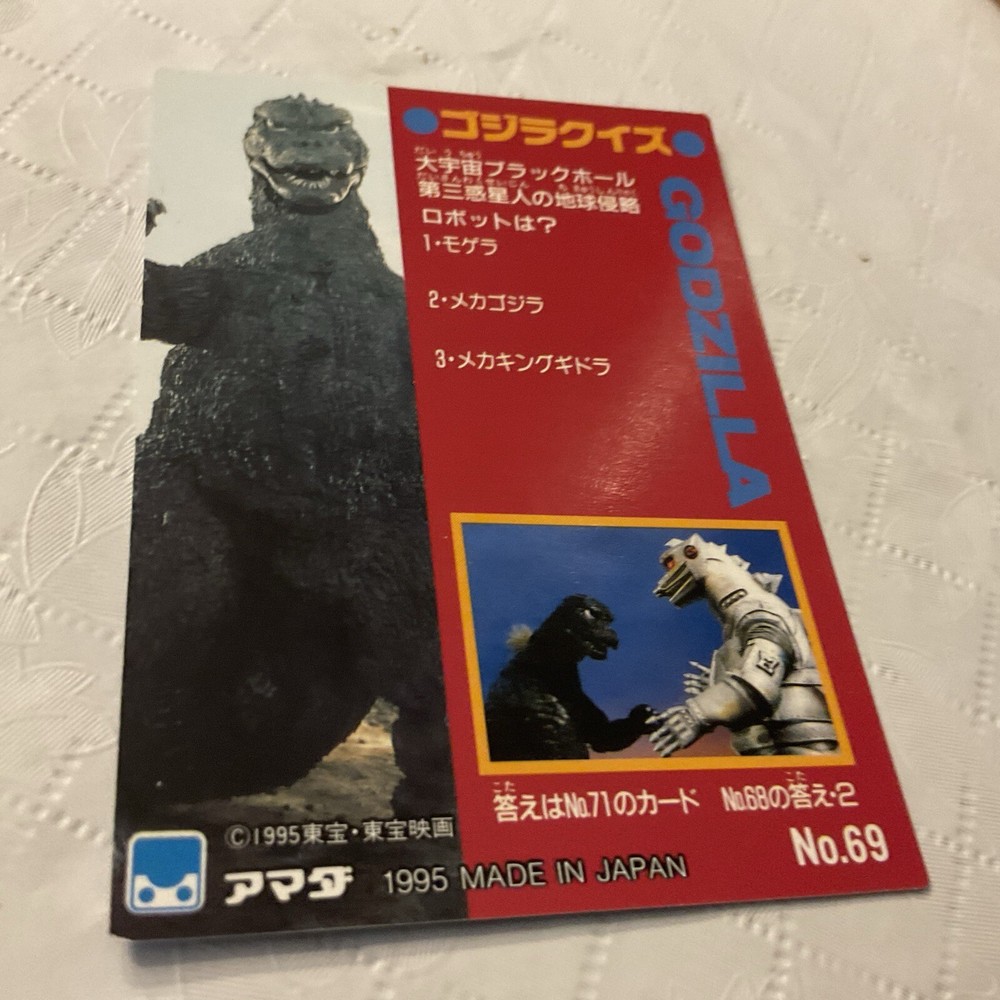 Introducing a rare gem from the 1995 Godzilla Collection Checklist, this Japan Trading Card #69 is a must-have for any collector of Non-Sport Trading Cards. Boasting features such as a comprehensive checklist, this card is definitely worth adding to your collection. Manufactured in Japan, this card has a very good Card Condition and was part of the Godzilla franchise. Grab this opportunity to own a piece of history from 1995.