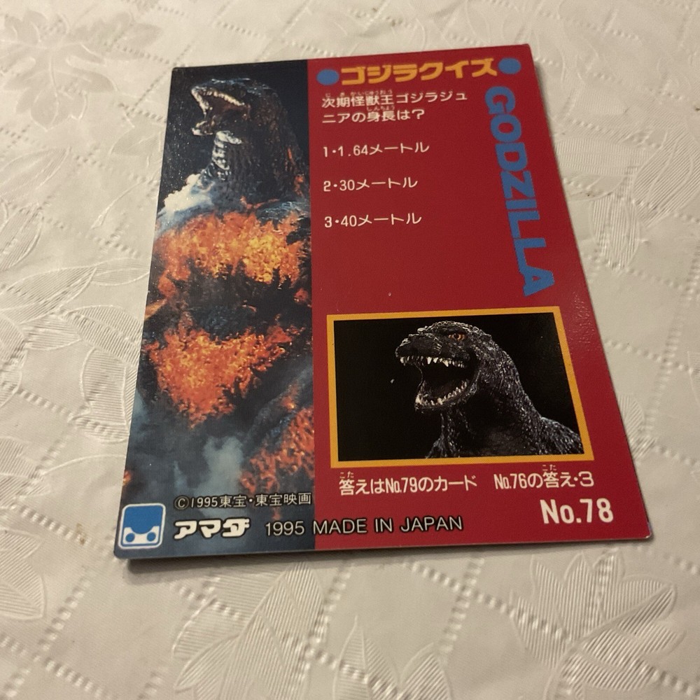 This 1995 Godzilla Collection Japan Trading Card #78 is a must-have for any avid collector of non-sport trading cards. This card features a checklist and is in very good condition, making it a rare find for fans of the Godzilla franchise. Manufactured in Japan in 1995, this card is a piece of history and a valuable addition to any collection. The card's aspects include Type - Non-Sport Trading Card, Year Manufactured - 1995, Franchise - Godzilla, Country/Region of Manufacture - Japan. It falls under the categories of Collectibles and Non-Sport Trading Cards. Don't miss out on the chance to add this unique piece to your collection.
